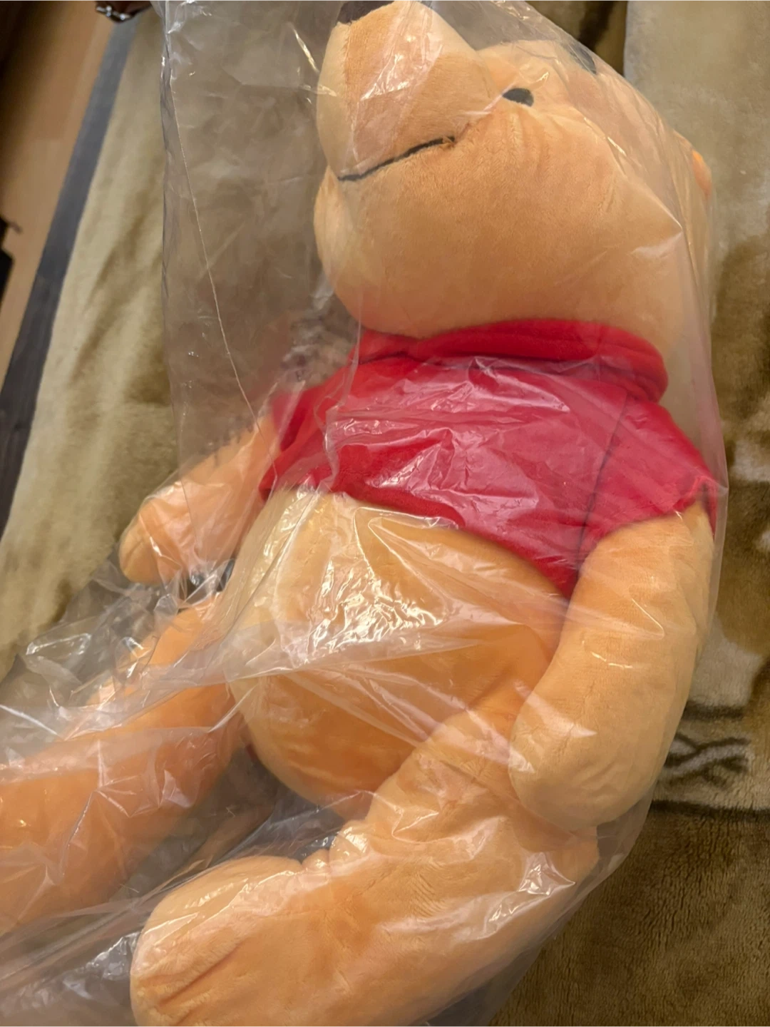 This is a Winnie the Pooh plush backpack. It's dressed in his classic red shirt and has a red scarf. Soft and cuddly for any fan!