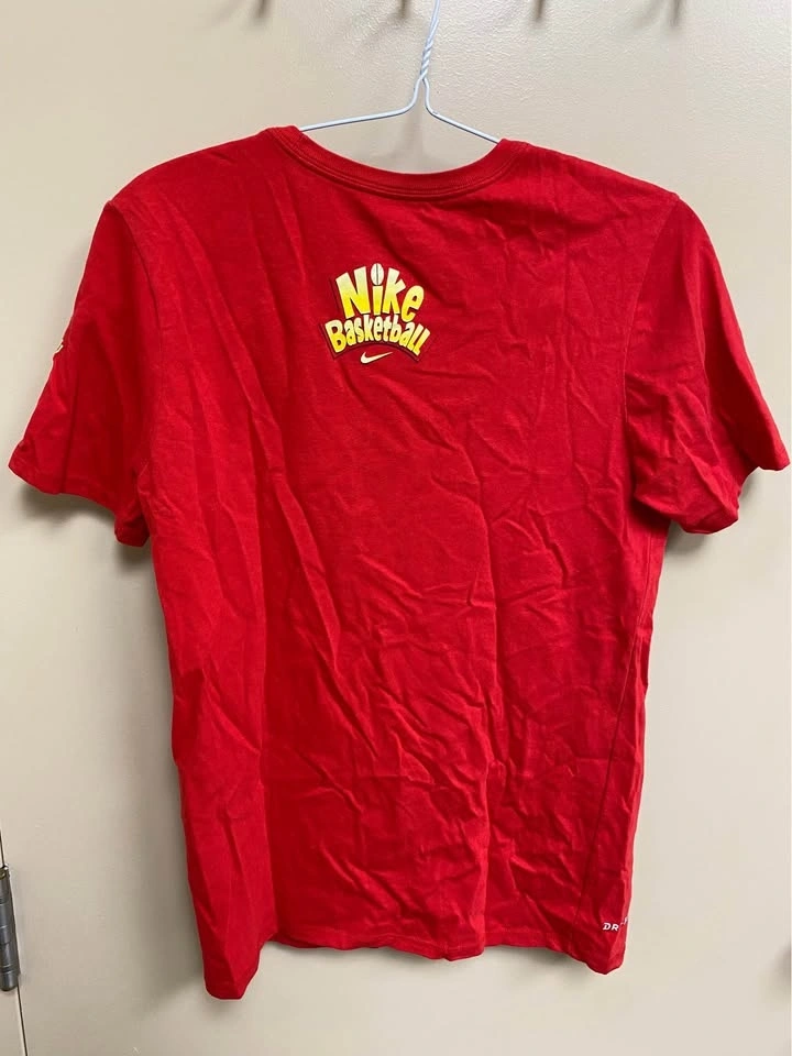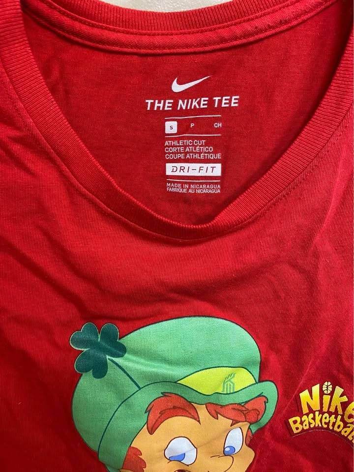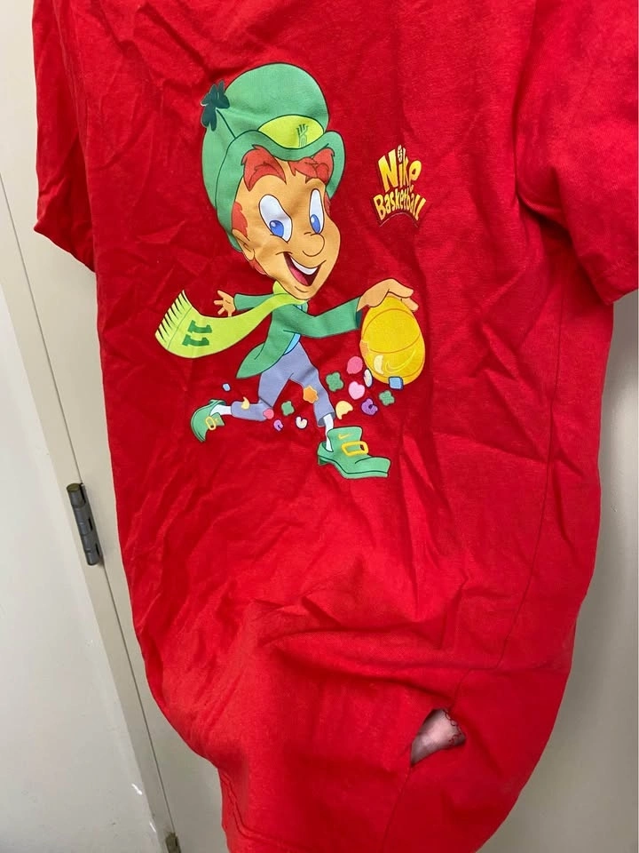This is a pre-owned Nike Basketball Kyrie Irving Lucky Charms T-Shirt in Men's Size Small, perfect for St. Patrick's Day. Please note there is a small hole in the seam, as shown in the photos.