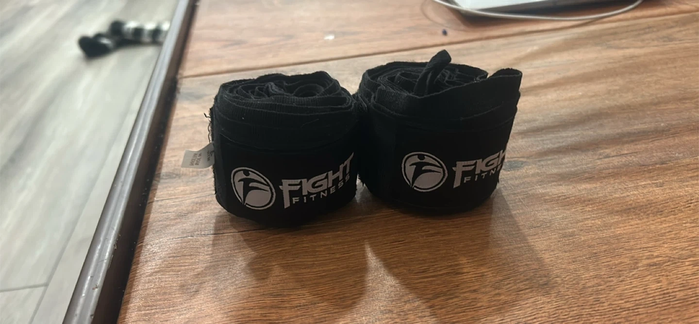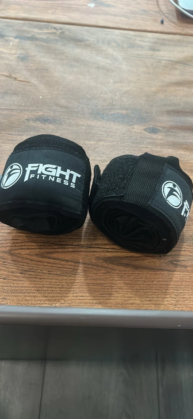 Two black hand wraps from Fight Fitness. These are used for boxing or martial arts to protect your hands. They feature velcro closures for a secure fit.