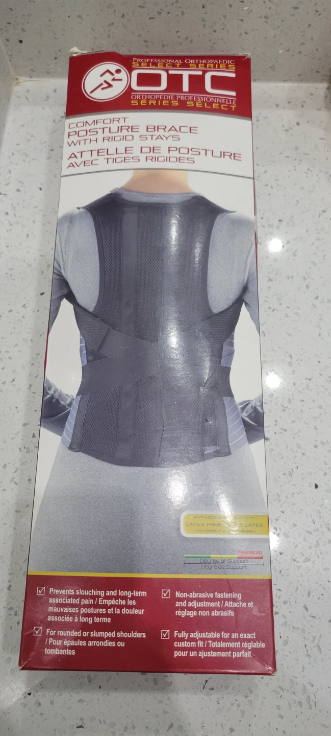 I'm selling an OTC Comfort Posture Brace with Rigid Stays, model 2456. It comes in its original box.