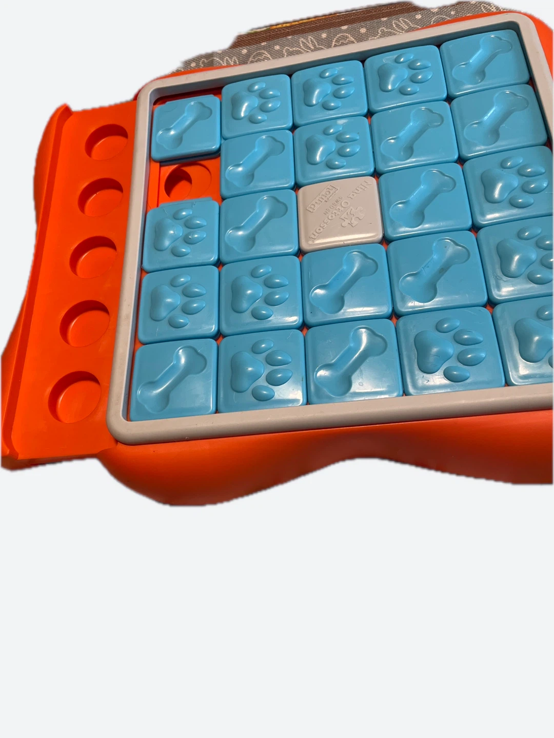 This SmartGames "Doggy Disco" puzzle game features 24 paw and bone tiles. It's a fun logic game for kids. The game board is orange and grey with blue puzzle pieces.