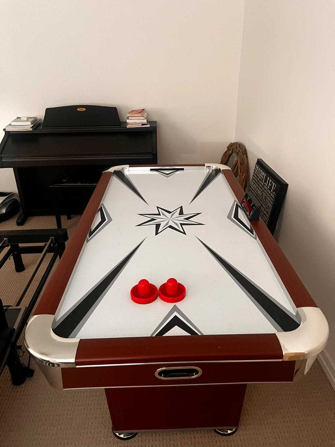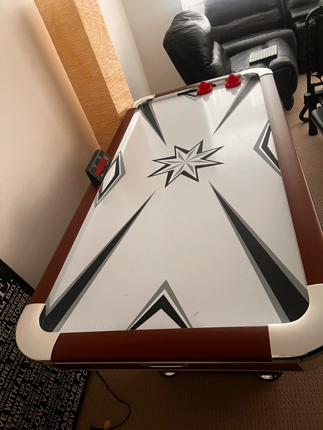 This air hockey table comes with two red pucks and a built-in electronic scorekeeper. It has a durable wood composite construction with a striking starburst graphic on the playfield. Perfect for family game nights or friendly competition!