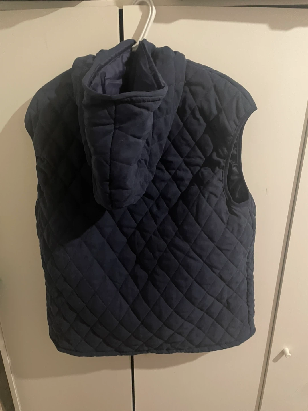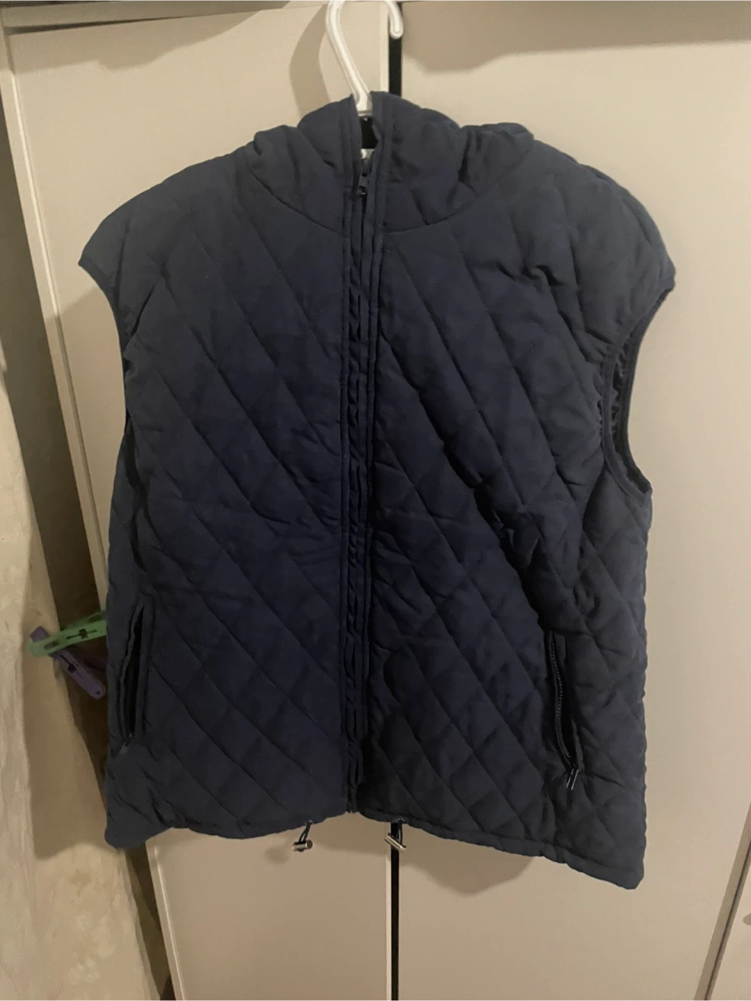 Here's a quilted navy vest that's in good condition! It has a hood and zipper.