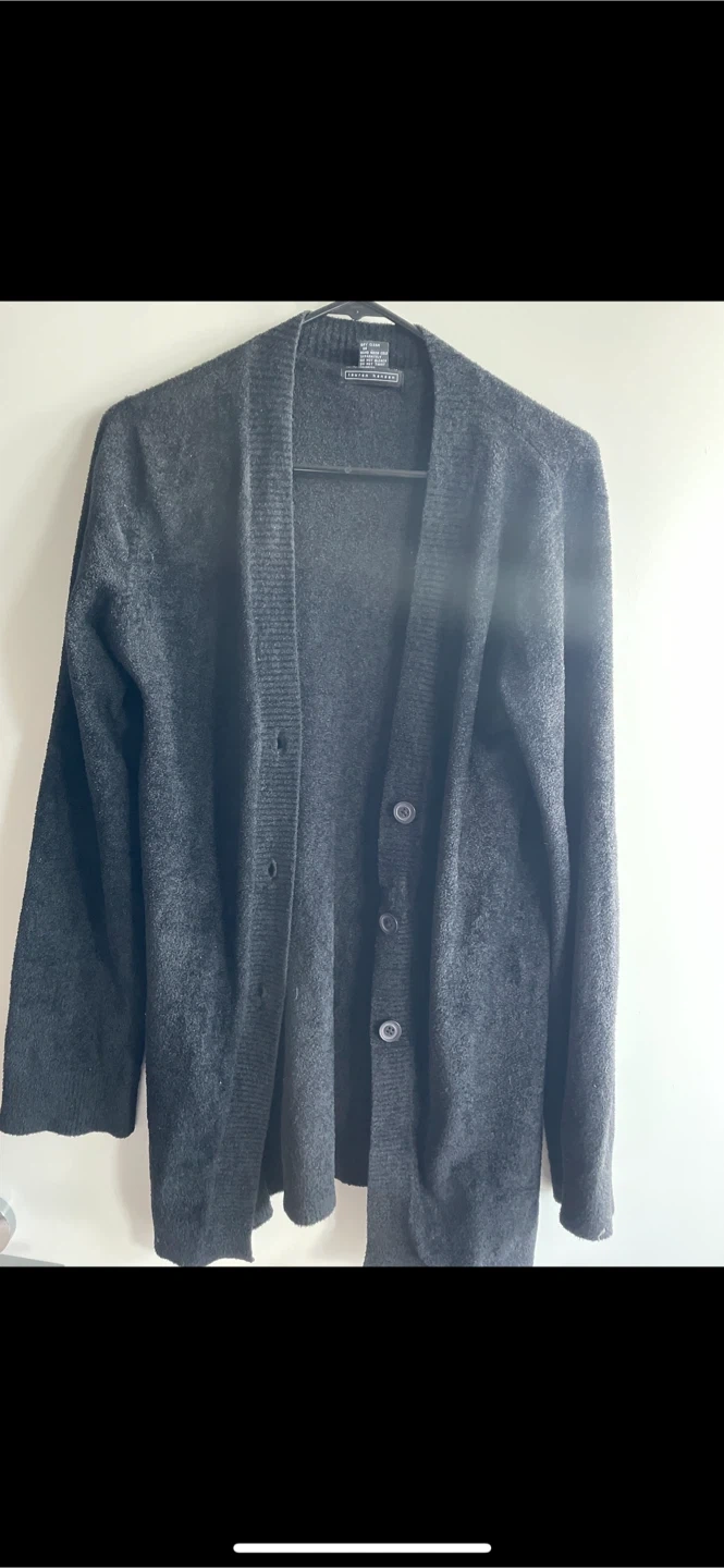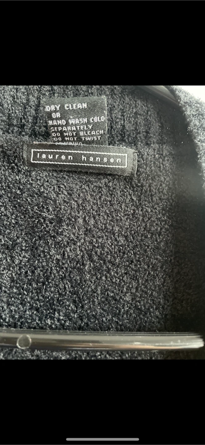 Cozy charcoal grey cardigan from Lauren Hansen. It features button closures and a soft texture. Dry clean or hand wash cold, separately. Do not bleach. Do not twist.