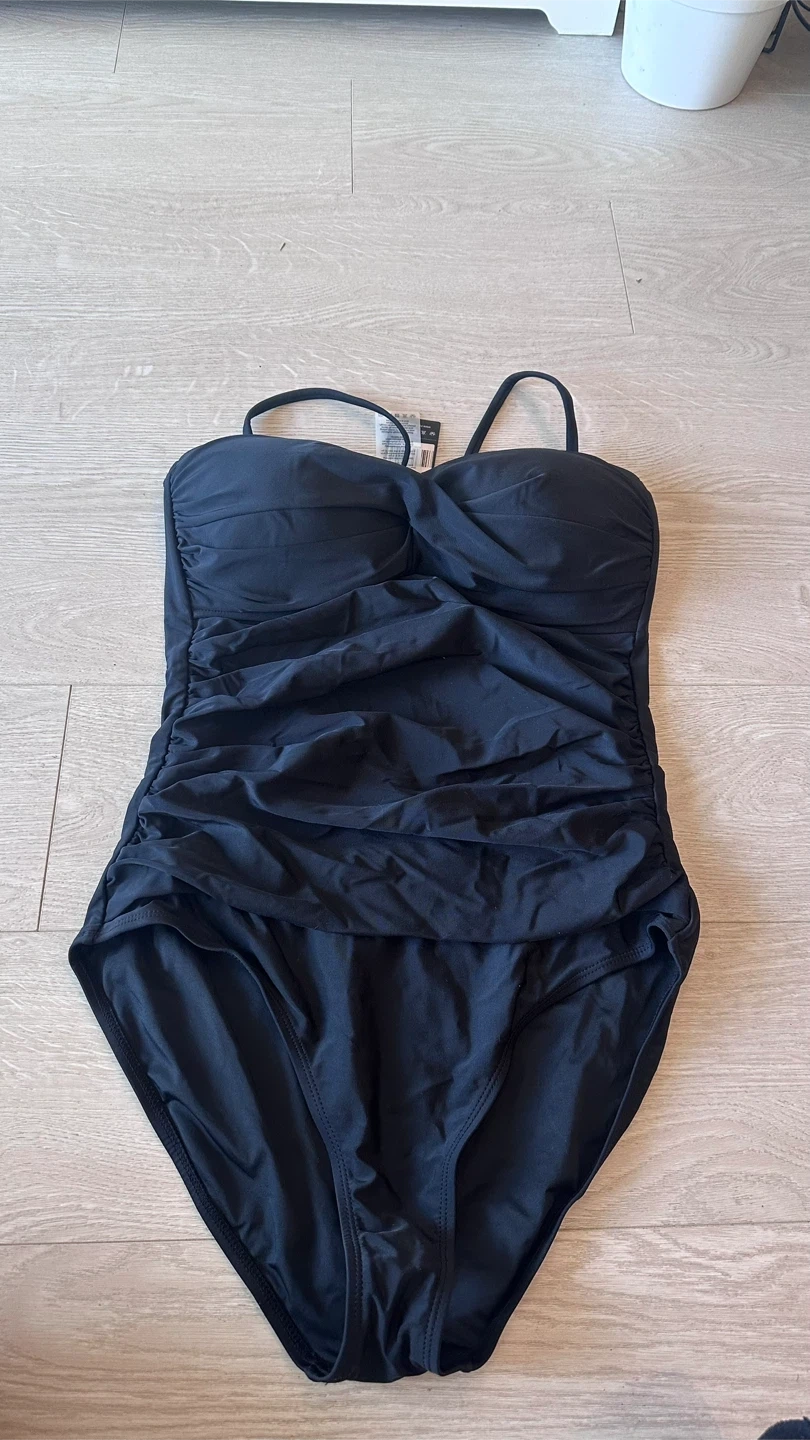 A ruched, black one-piece swimsuit with a sweetheart neckline. It features adjustable straps and a comfortable fit. Made for sunny days by the water!