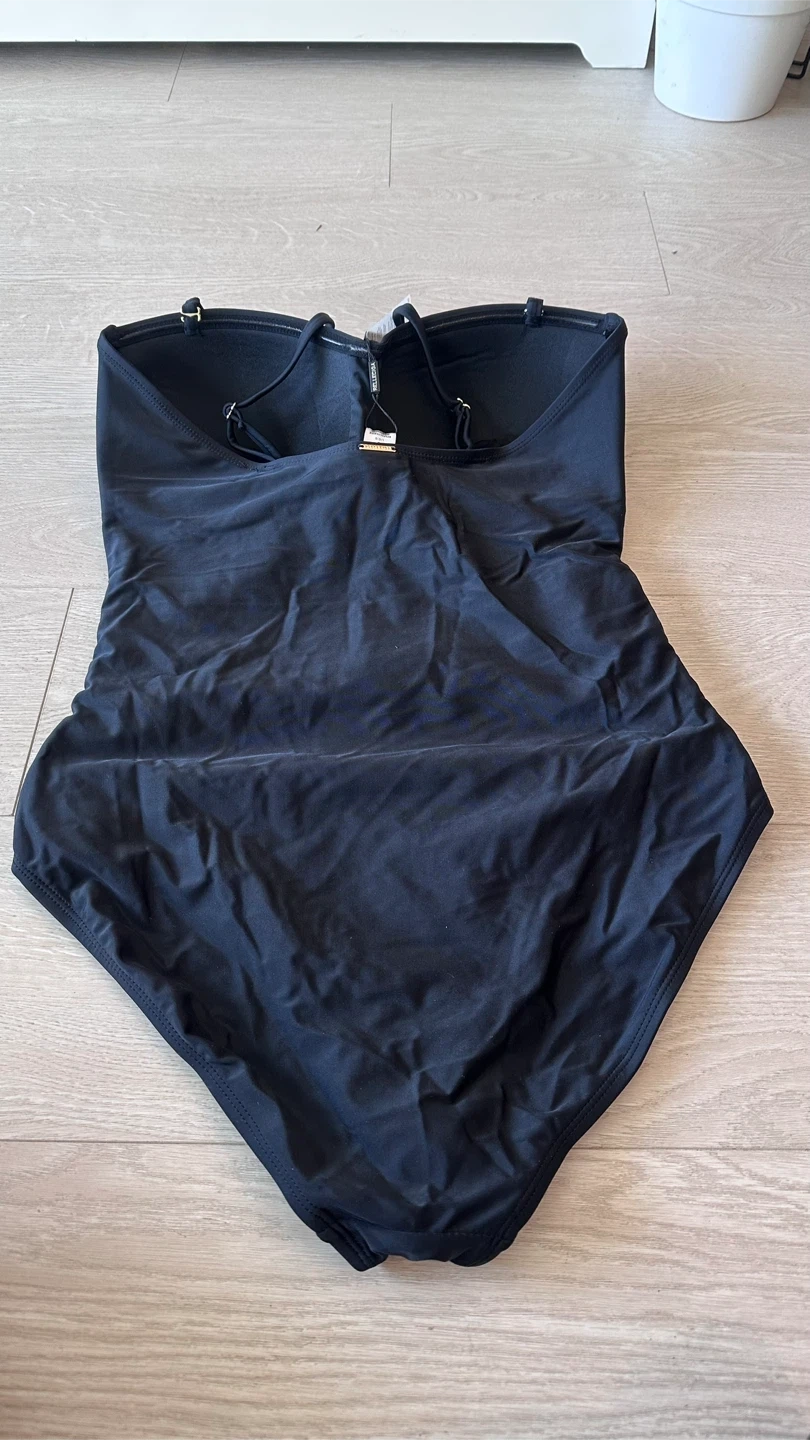 A ruched, black one-piece swimsuit with a sweetheart neckline. It features adjustable straps and a comfortable fit. Made for sunny days by the water!