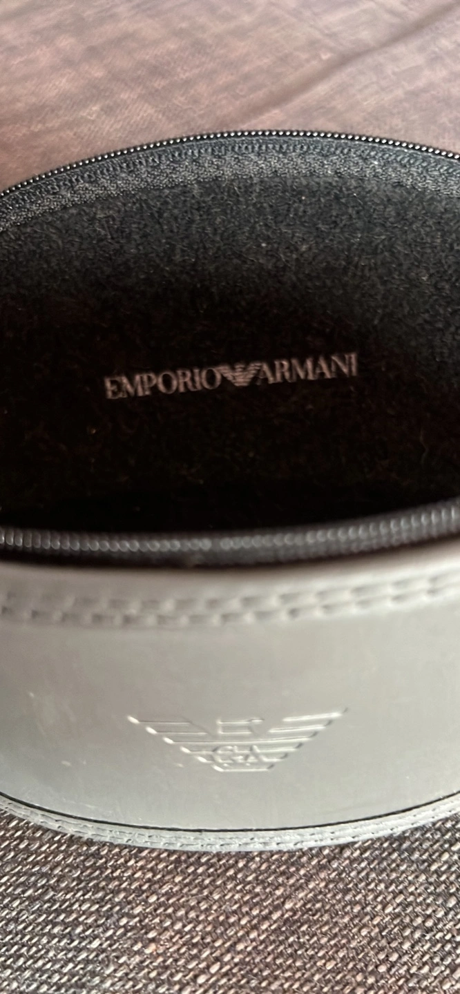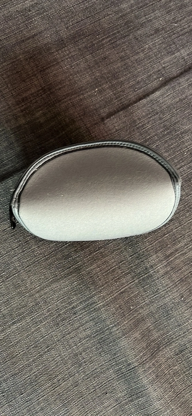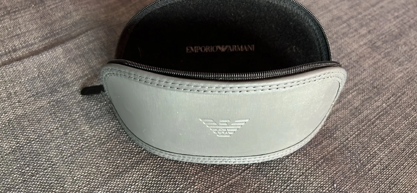 Grey zippered sunglasses case with black interior. Brand logo embossed on the outside.