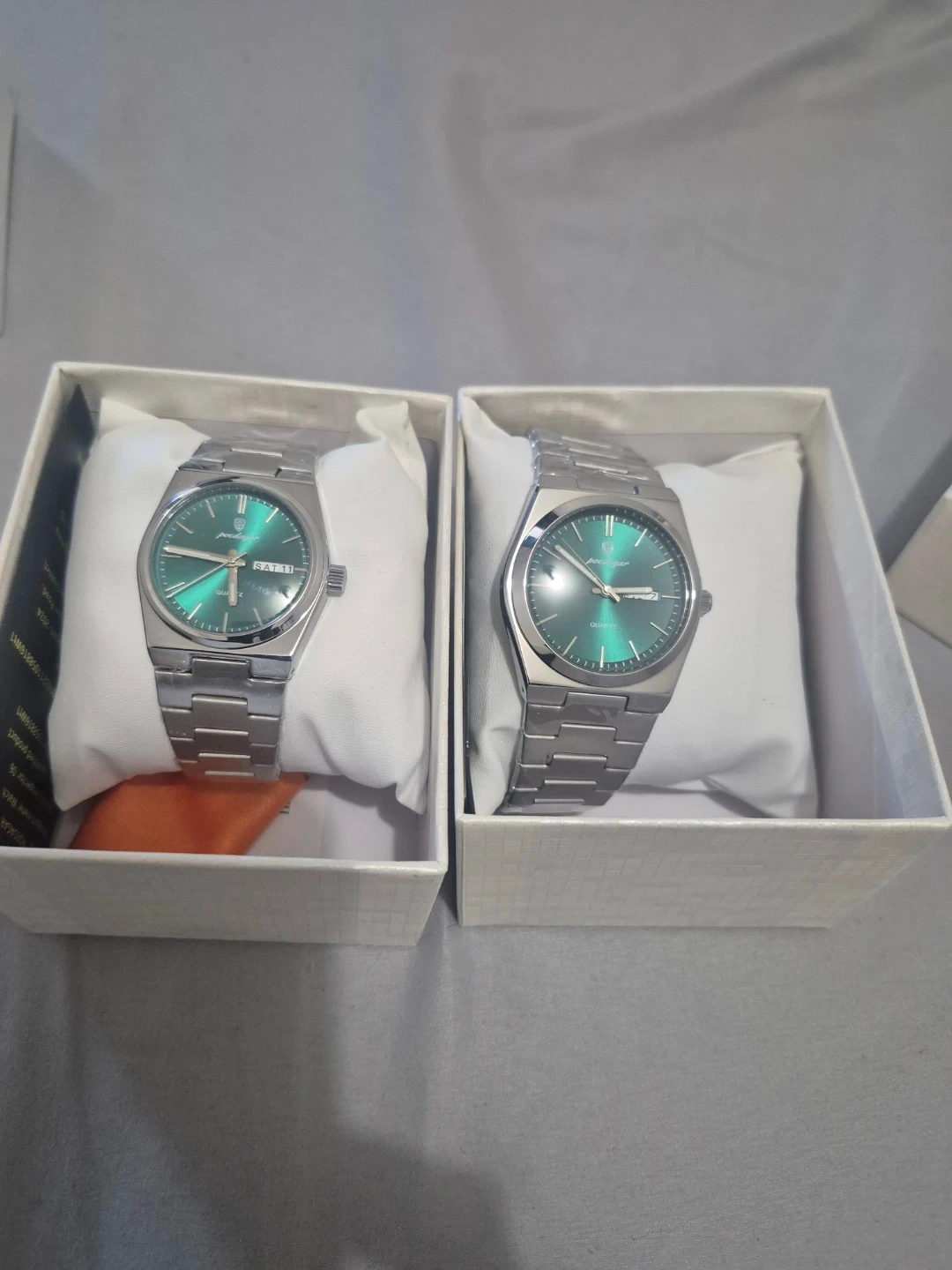 Two Pcdagar men's watches with green dials and stainless steel bands. Both are quartz movements. They come in original boxes.