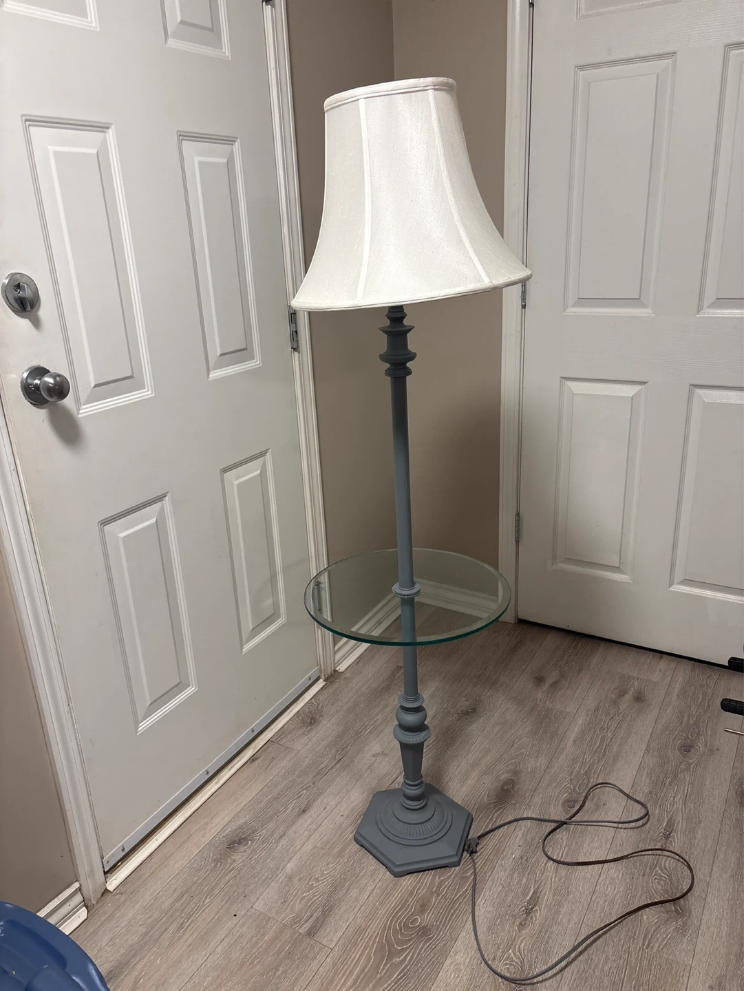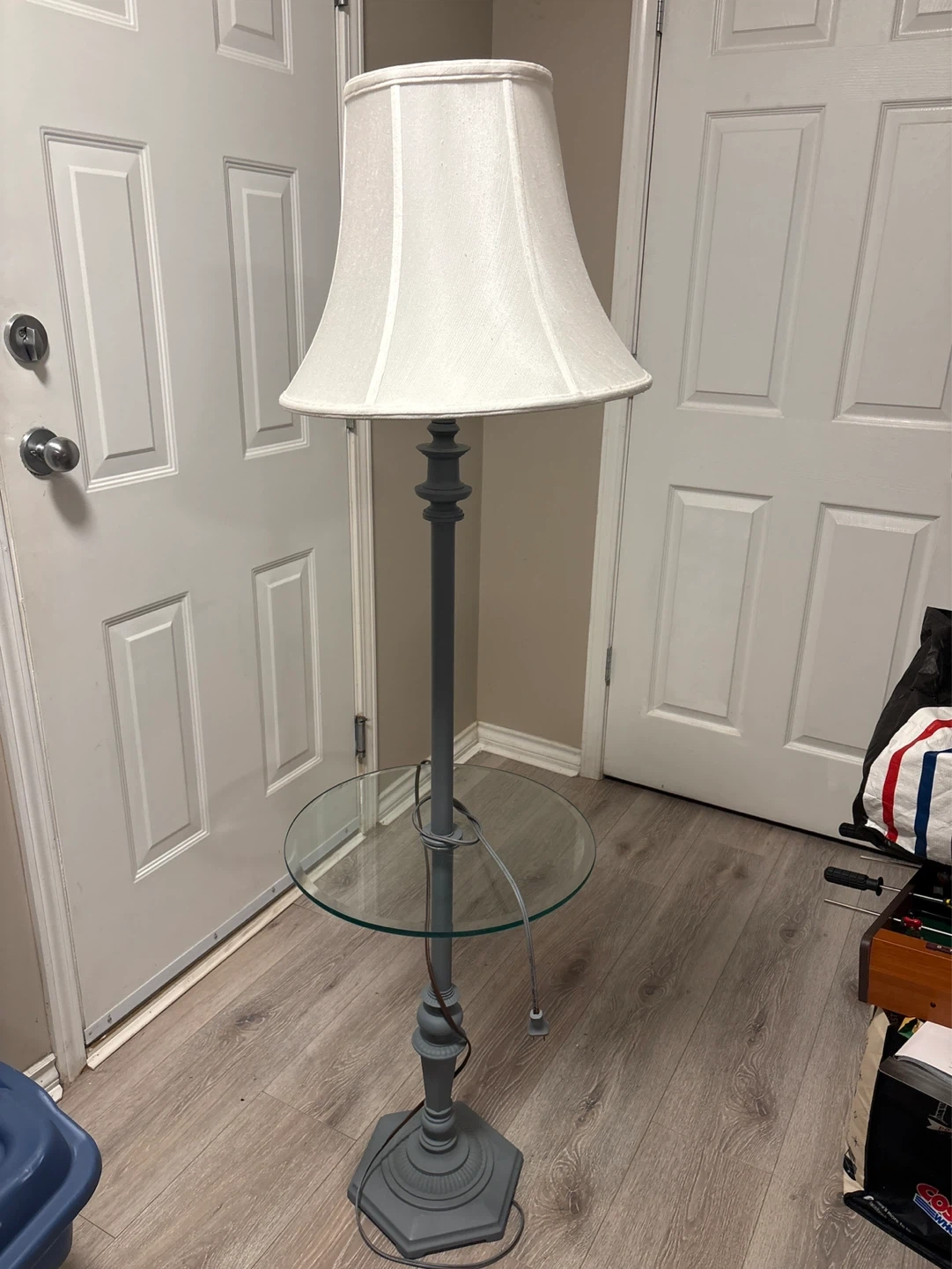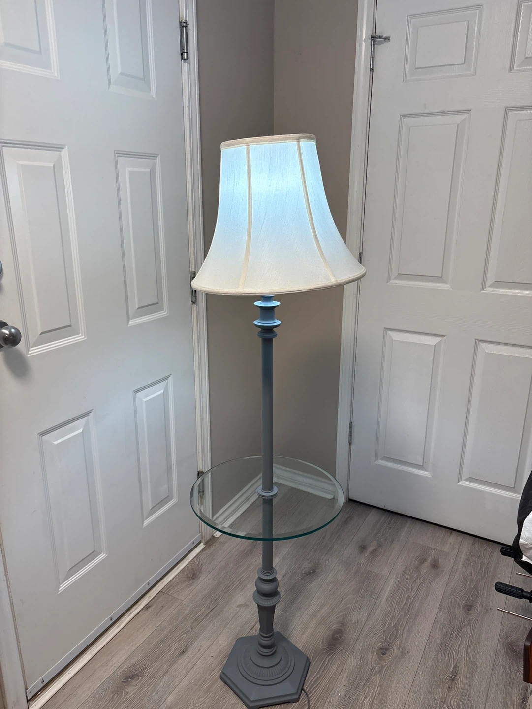 This is a grey floor lamp with a convenient glass side table attached. It's a great piece for adding light and a bit of surface space to a room. The lamp has a classic lampshade design and a sturdy base.