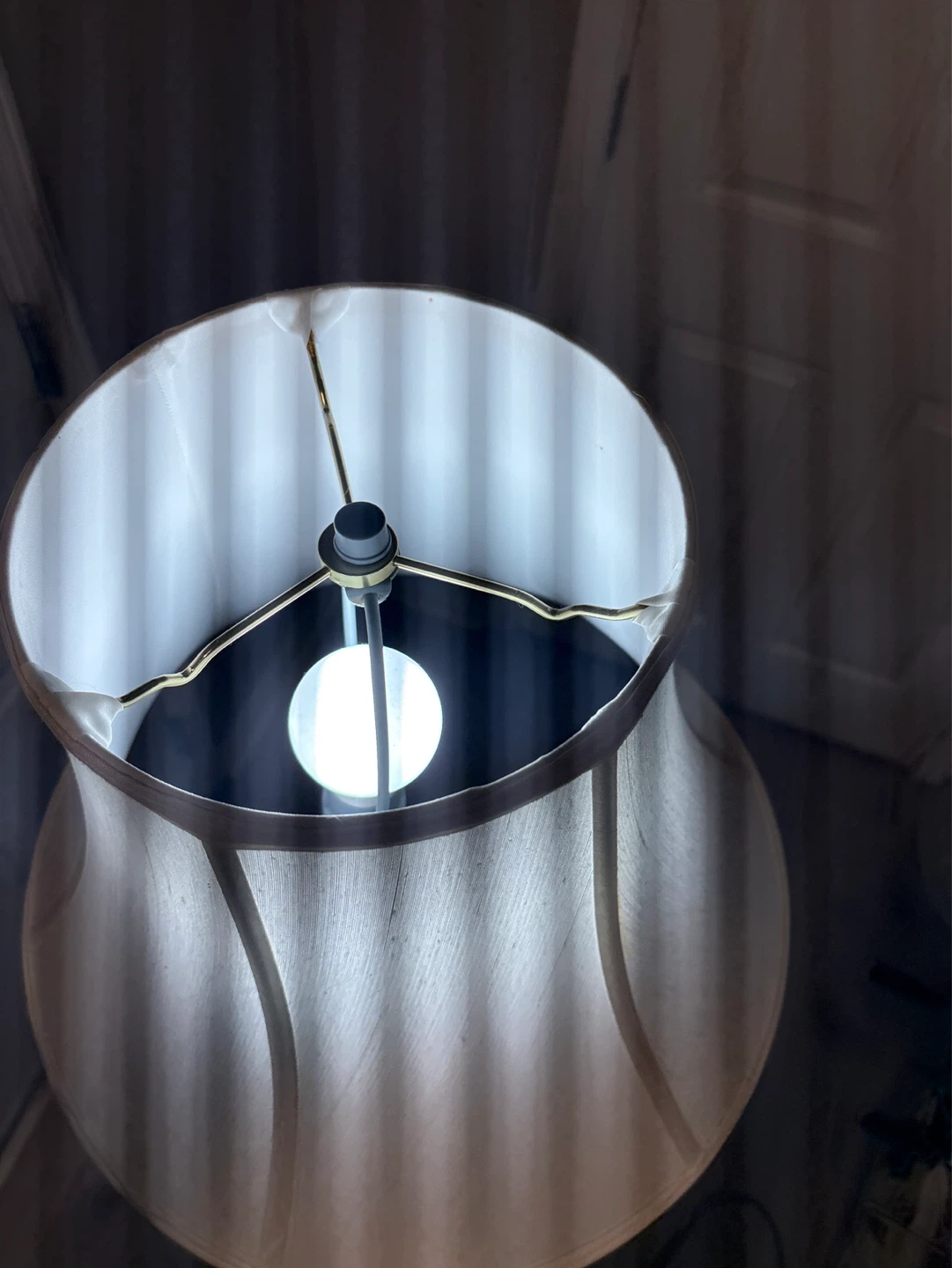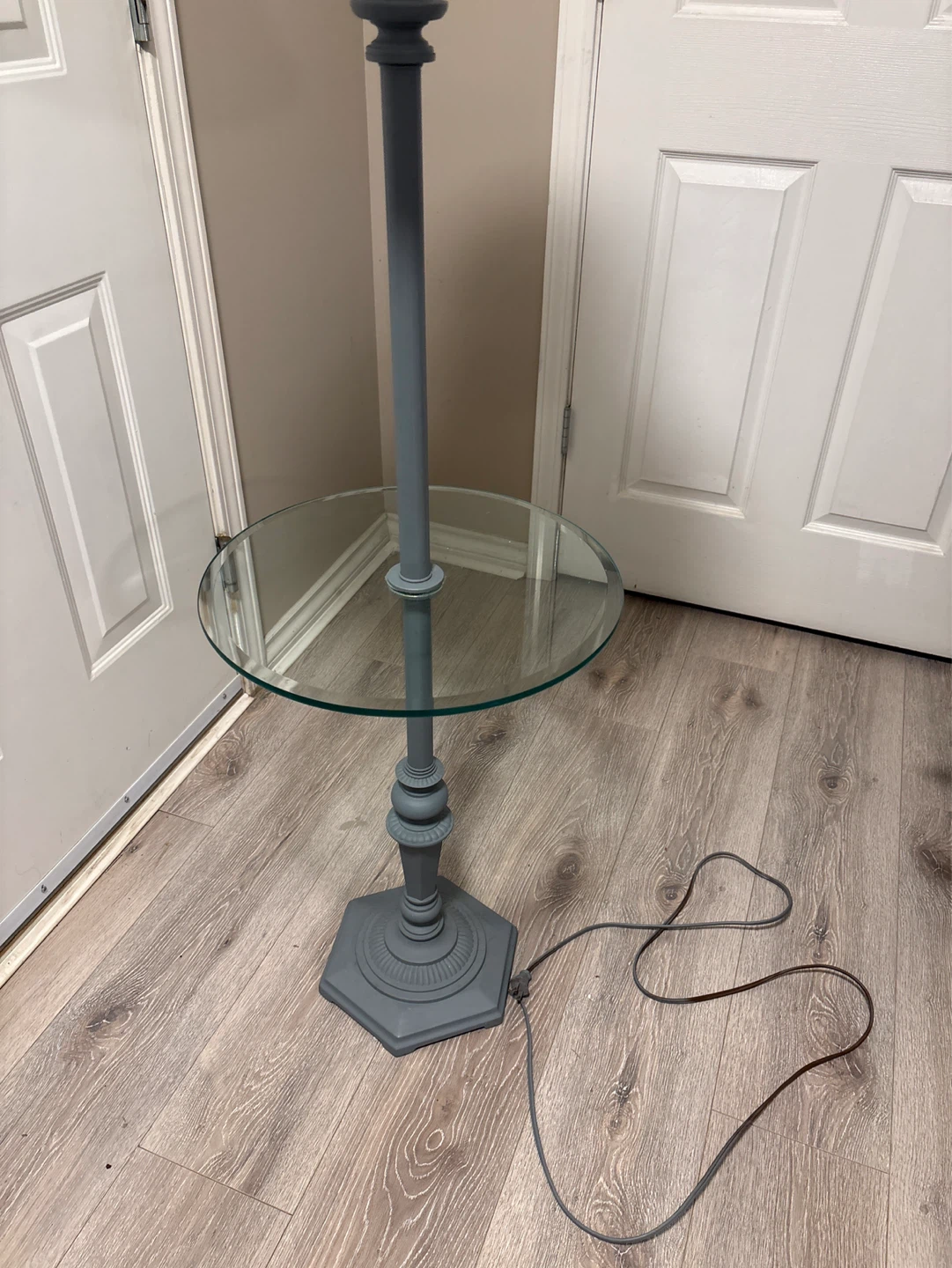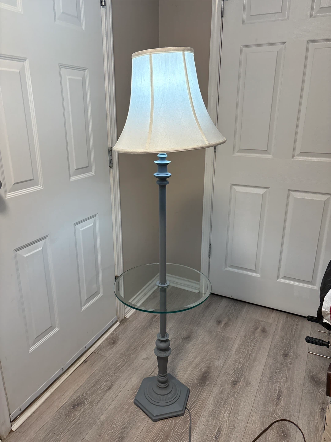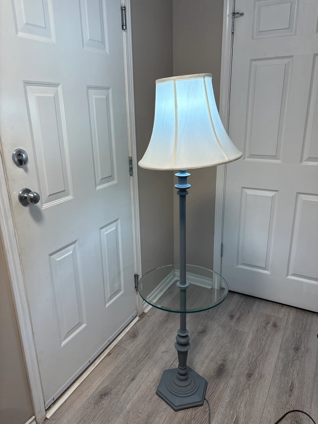 This is a grey floor lamp with a convenient glass side table attached. It's a great piece for adding light and a bit of surface space to a room. The lamp has a classic lampshade design and a sturdy base.