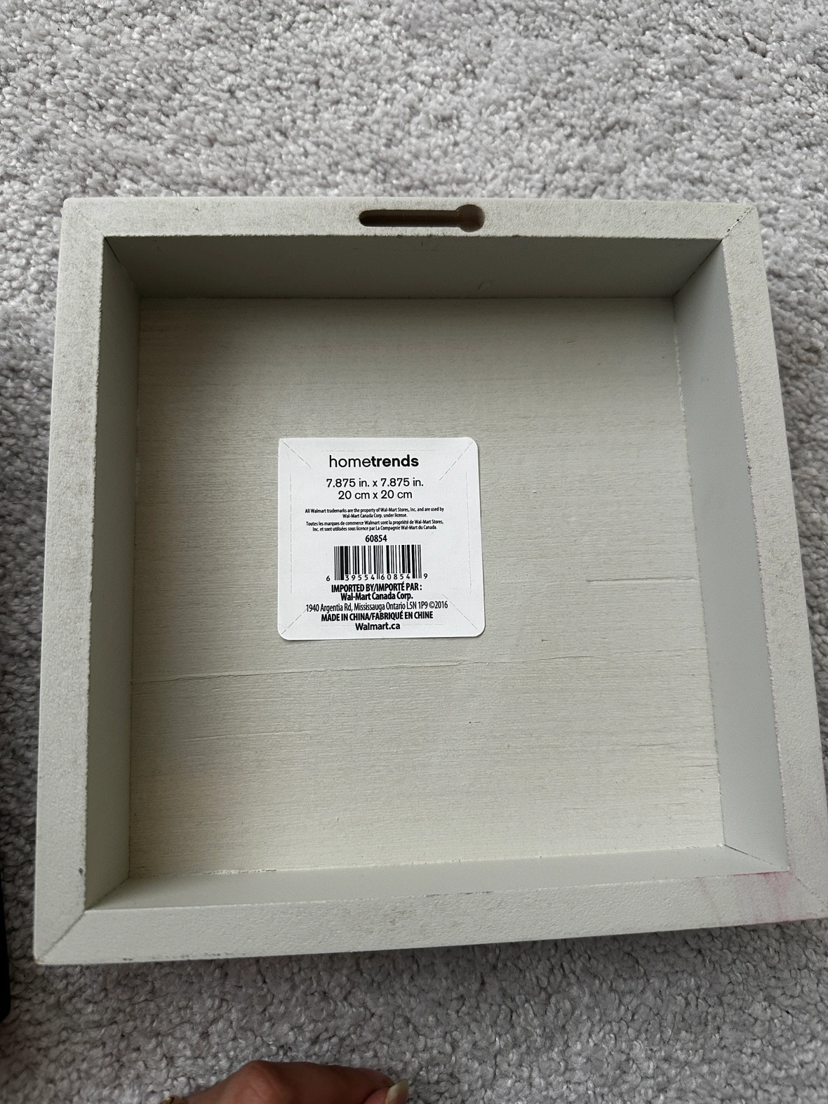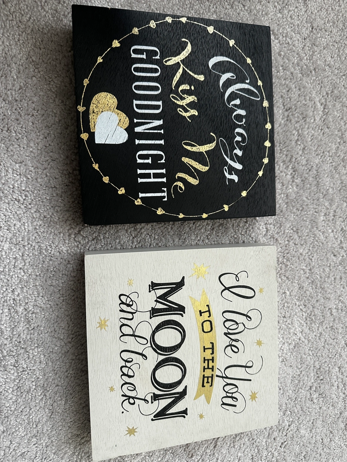 Two wooden signs with a romantic theme, great for adding a touch of love to your home. They measure approximately 8 inches by 8 inches. They are in great condition.