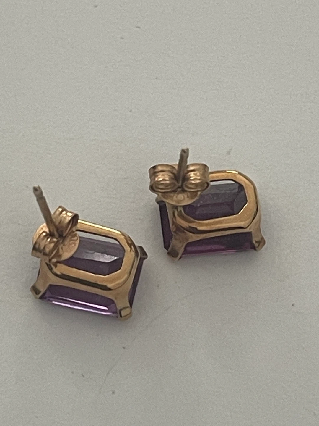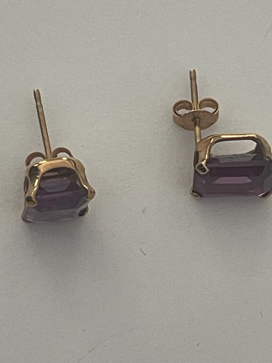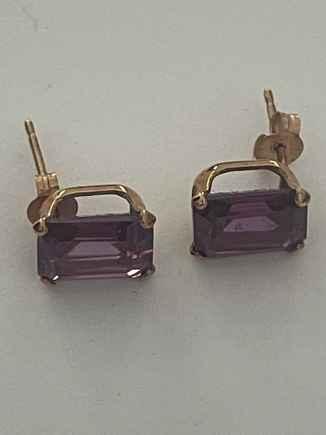 Here are some lovely earrings featuring a purple gemstone on 10k gold. They have a genuine