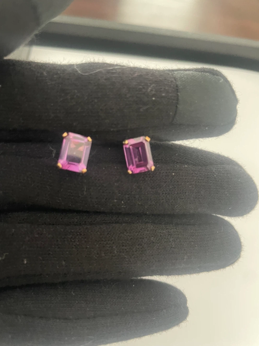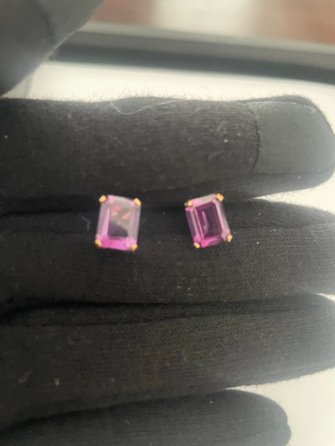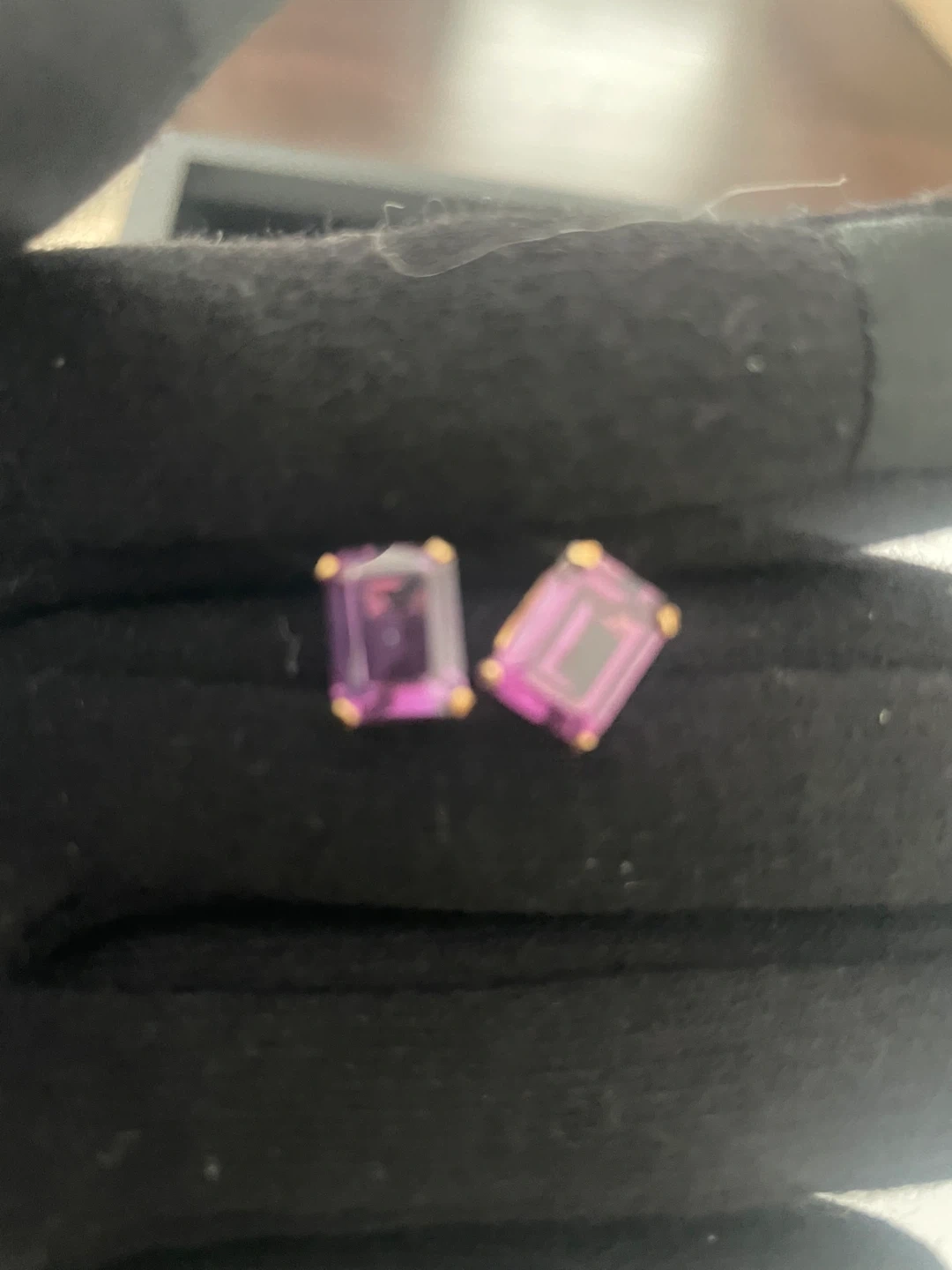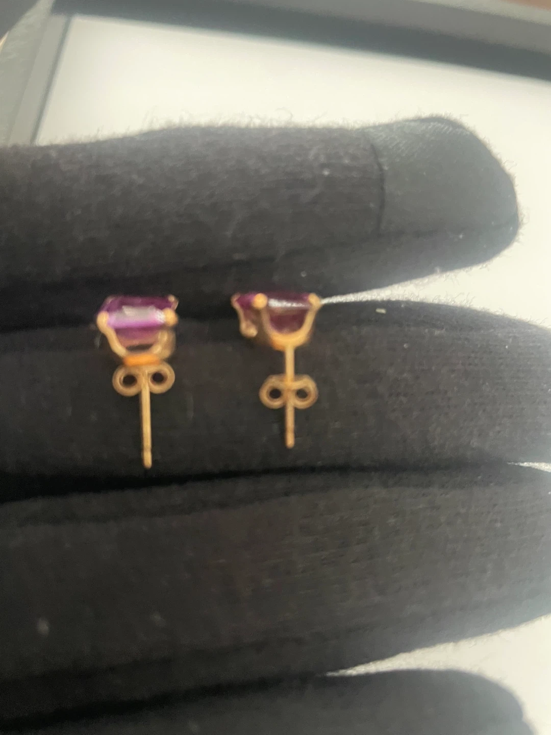Here are some lovely earrings featuring a purple gemstone on 10k gold. They have a genuine