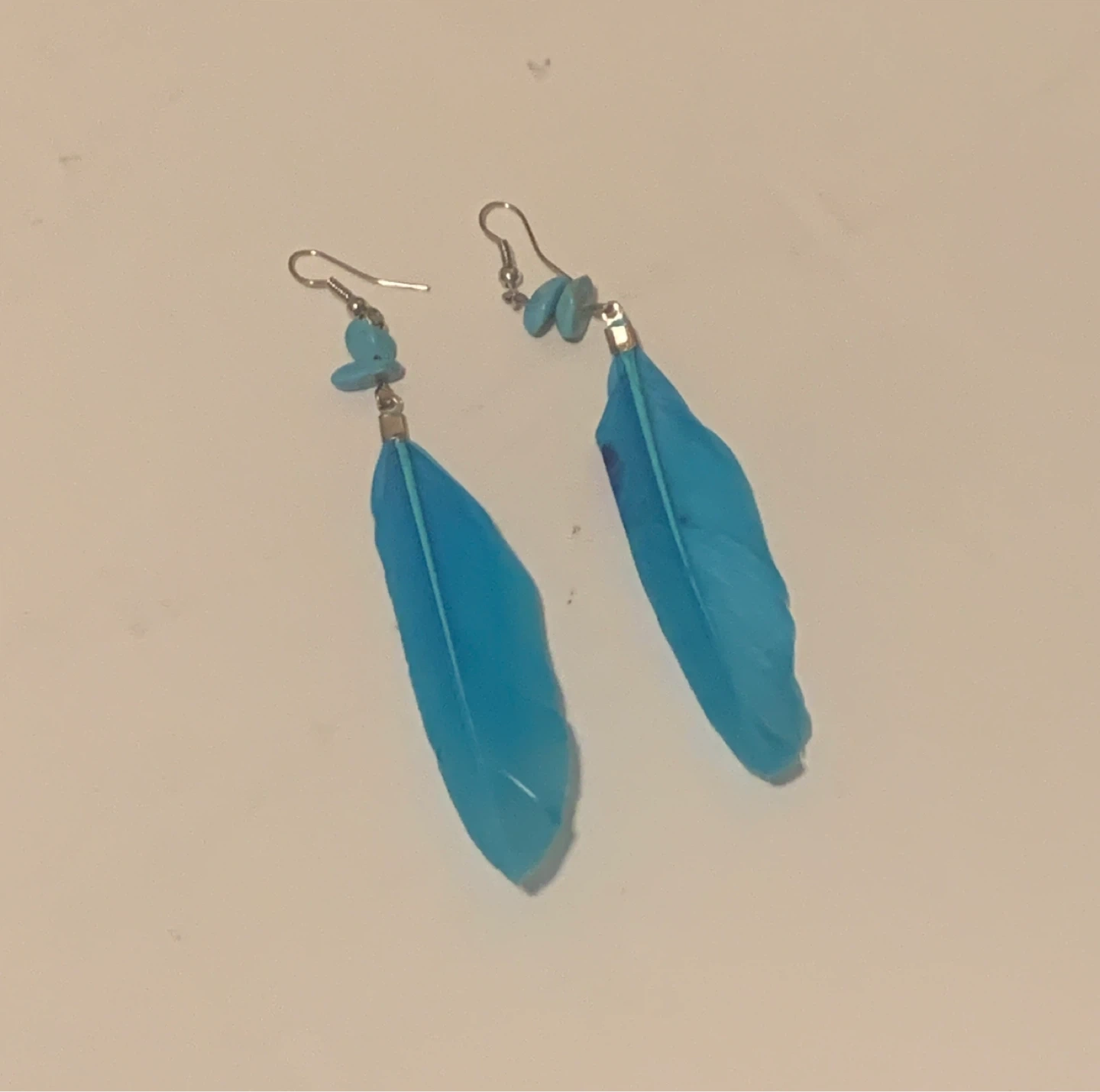 These eye-catching earrings feature bright blue feathers and small turquoise-coloured beads. They hang from silver-toned fishhook ear wires. It's a fun accessory for adding a pop of colour!