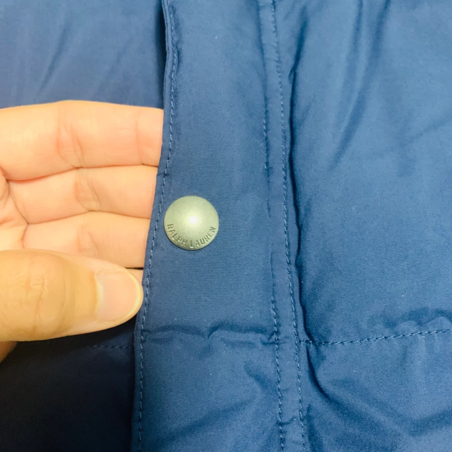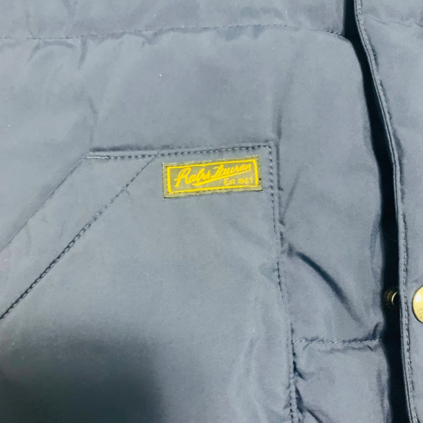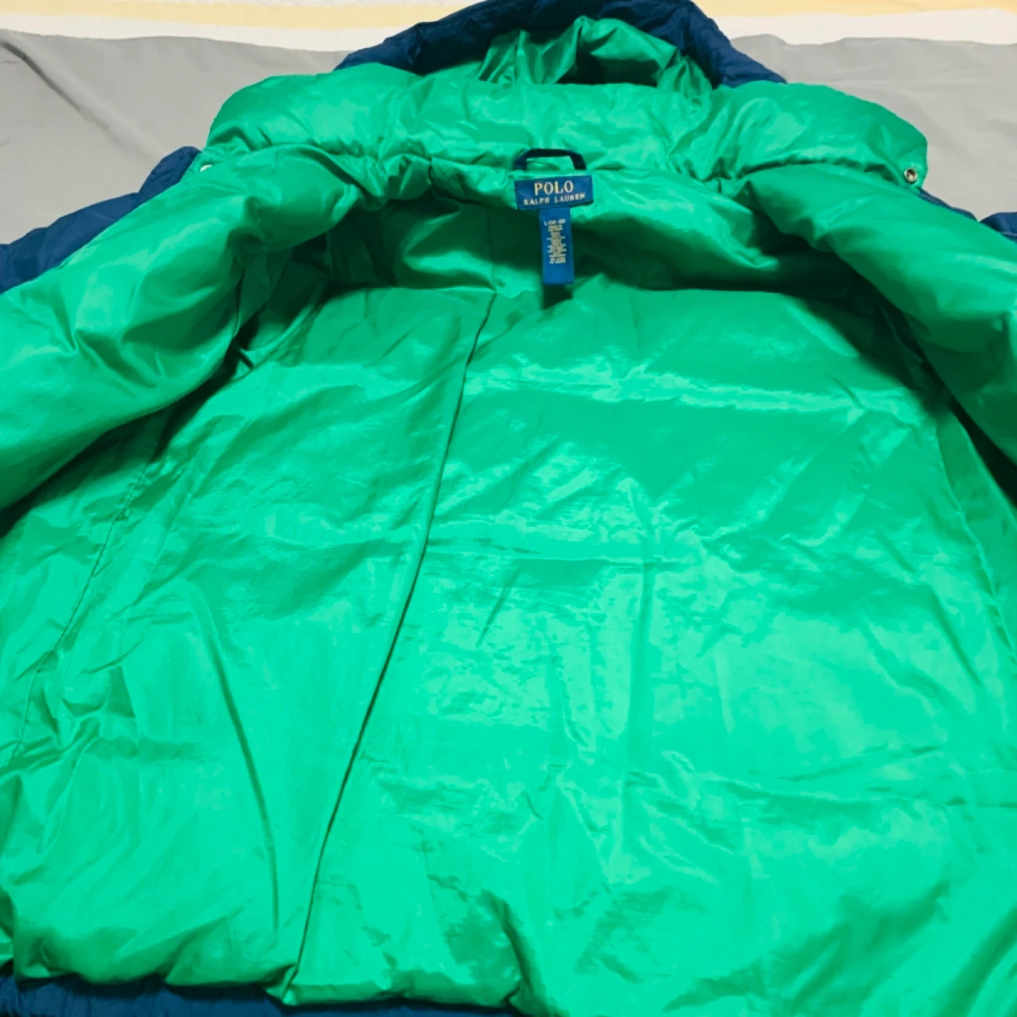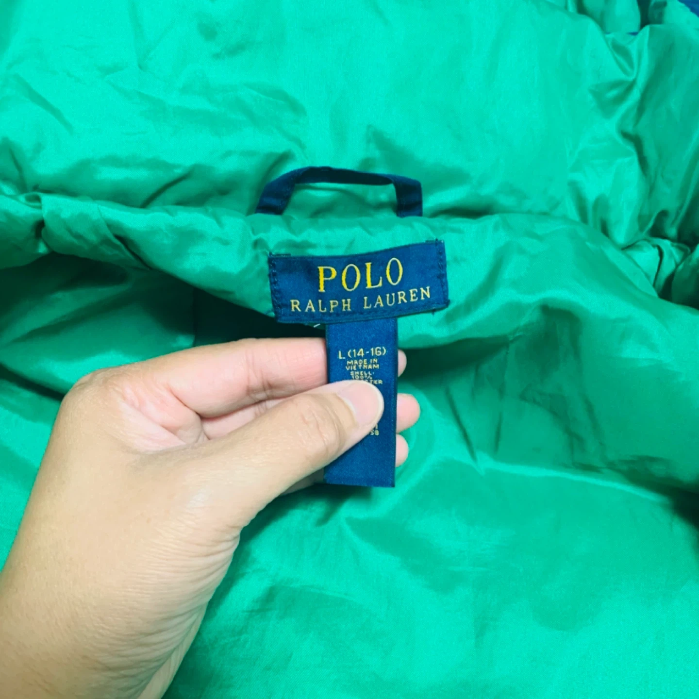 This is a blue Ralph Lauren puffer jacket with a green interior. It's a size L (14-16). The jacket features the iconic Polo Ralph Lauren logo and 'Est. 1967' detailing on a front pocket tag. It's perfect for keeping warm during cooler weather!