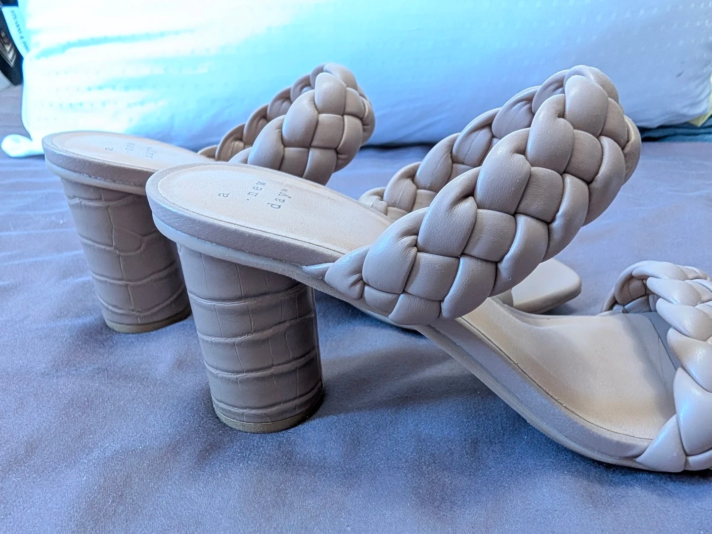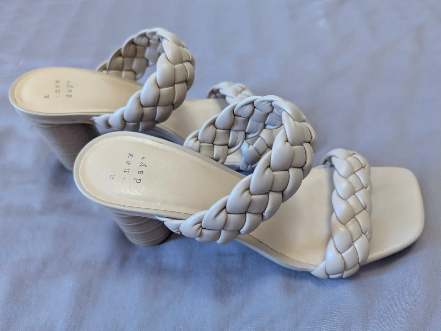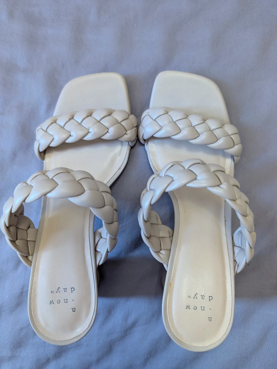 Target slide sandals feature a stylish braided strap design and a comfortable block heel. They're a cream colour and come in a size 8. Perfect for adding a touch of chic to any outfit!