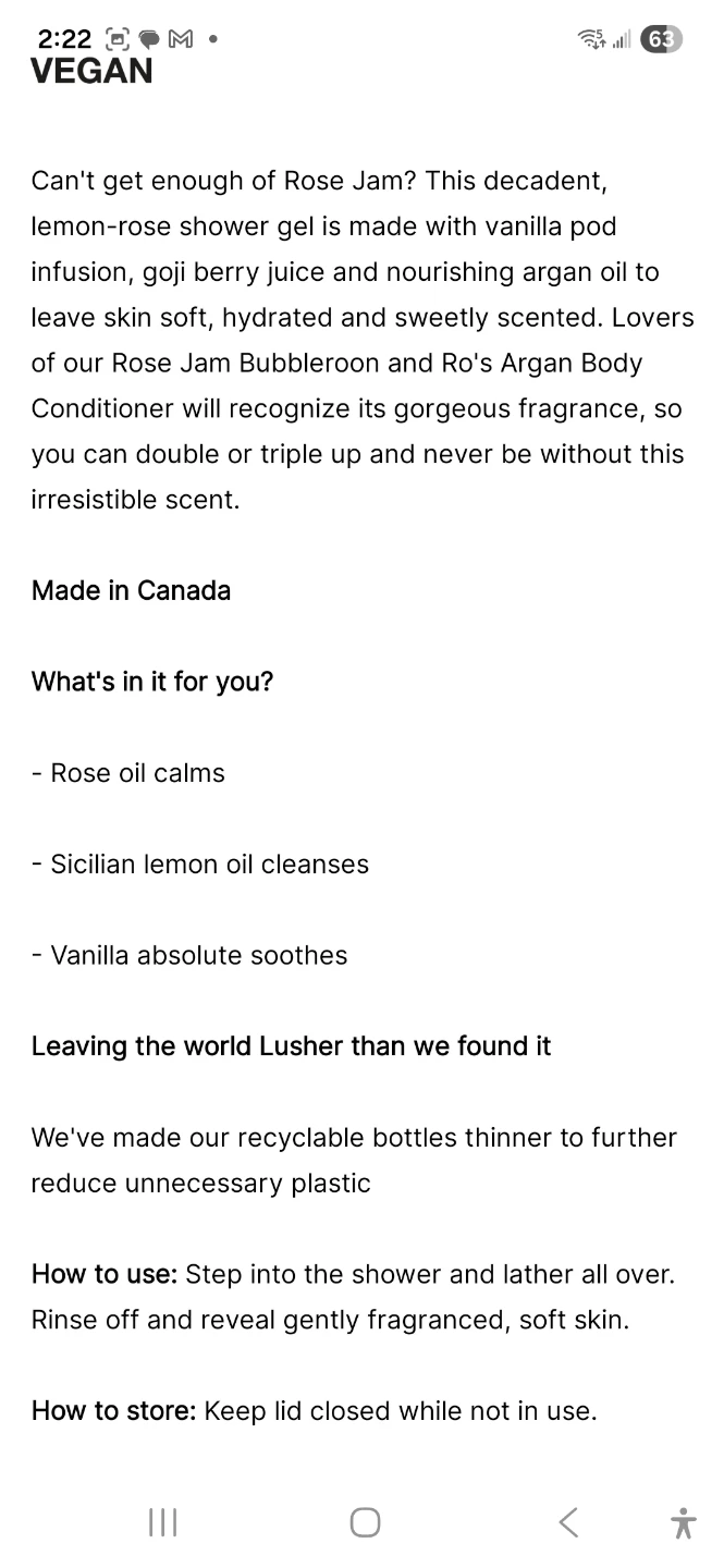 This shower gel has a decadent rose and bright lemon scent that leaves skin feeling soft, hydrated, and sweetly scented. It is made with vanilla pod infusion, goji berry juice and nourishing argan oil.