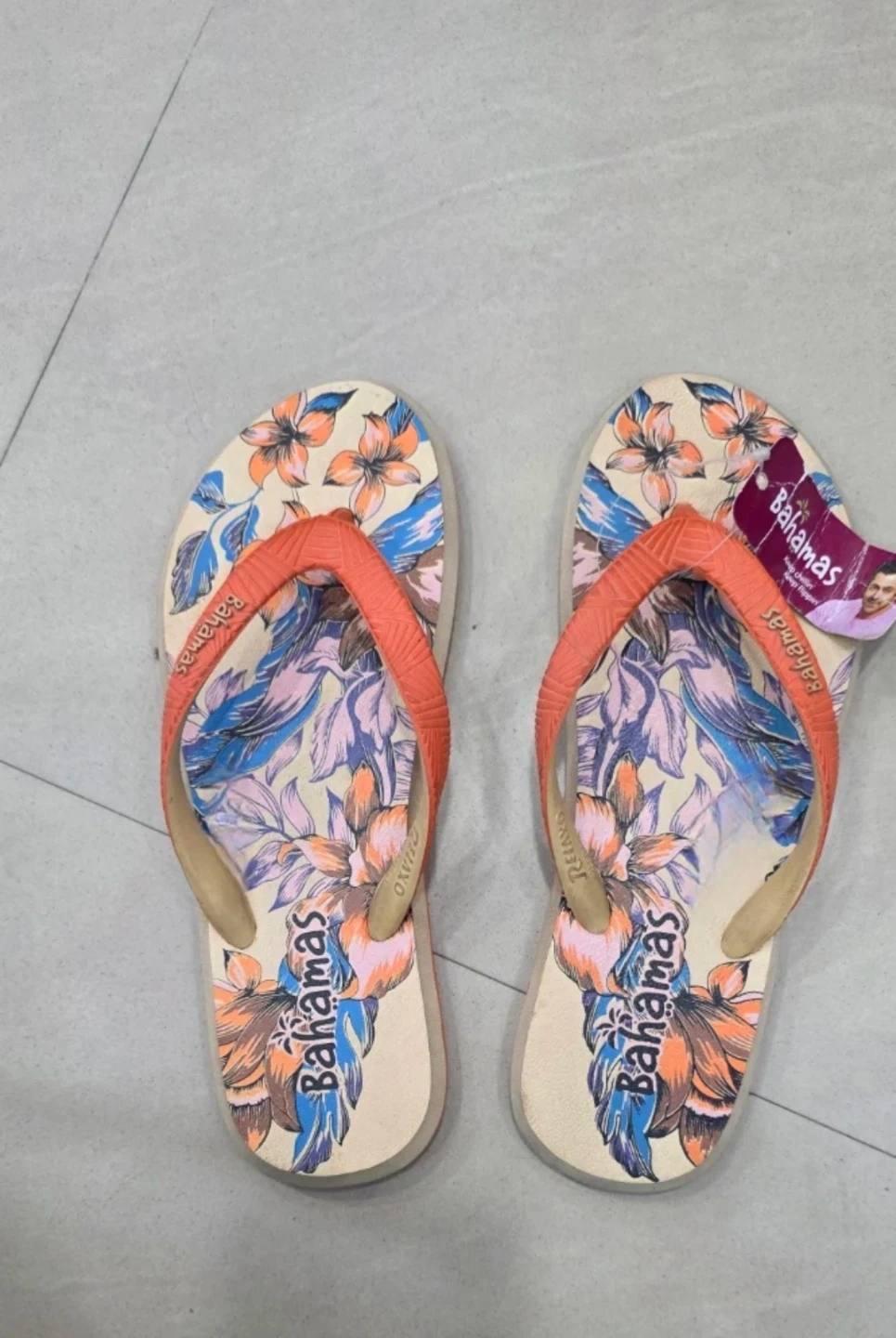 These Bahamas flip flops feature a vibrant floral design with orange straps. They're perfect for casual wear. Comfortable and easy to slip on!