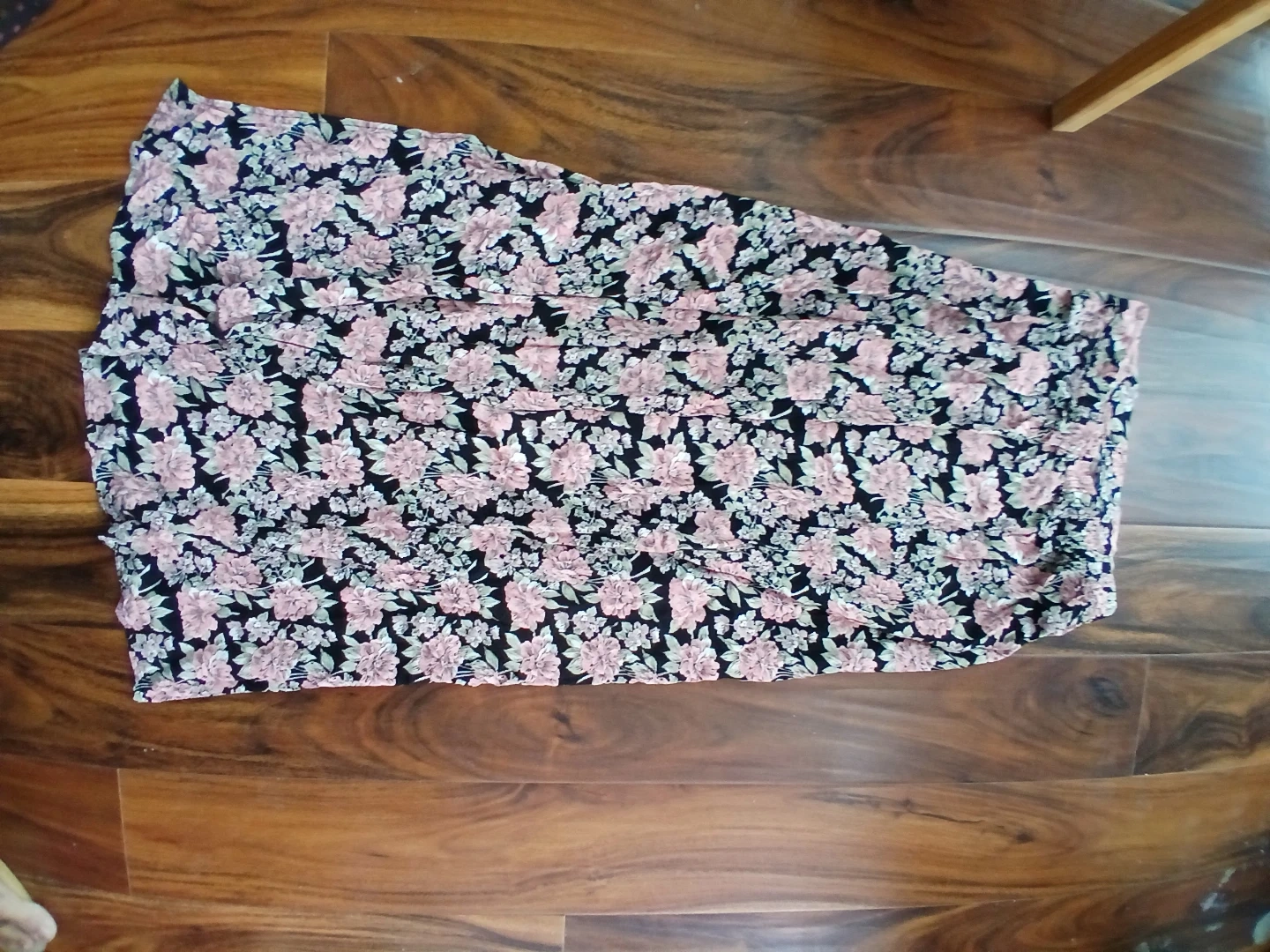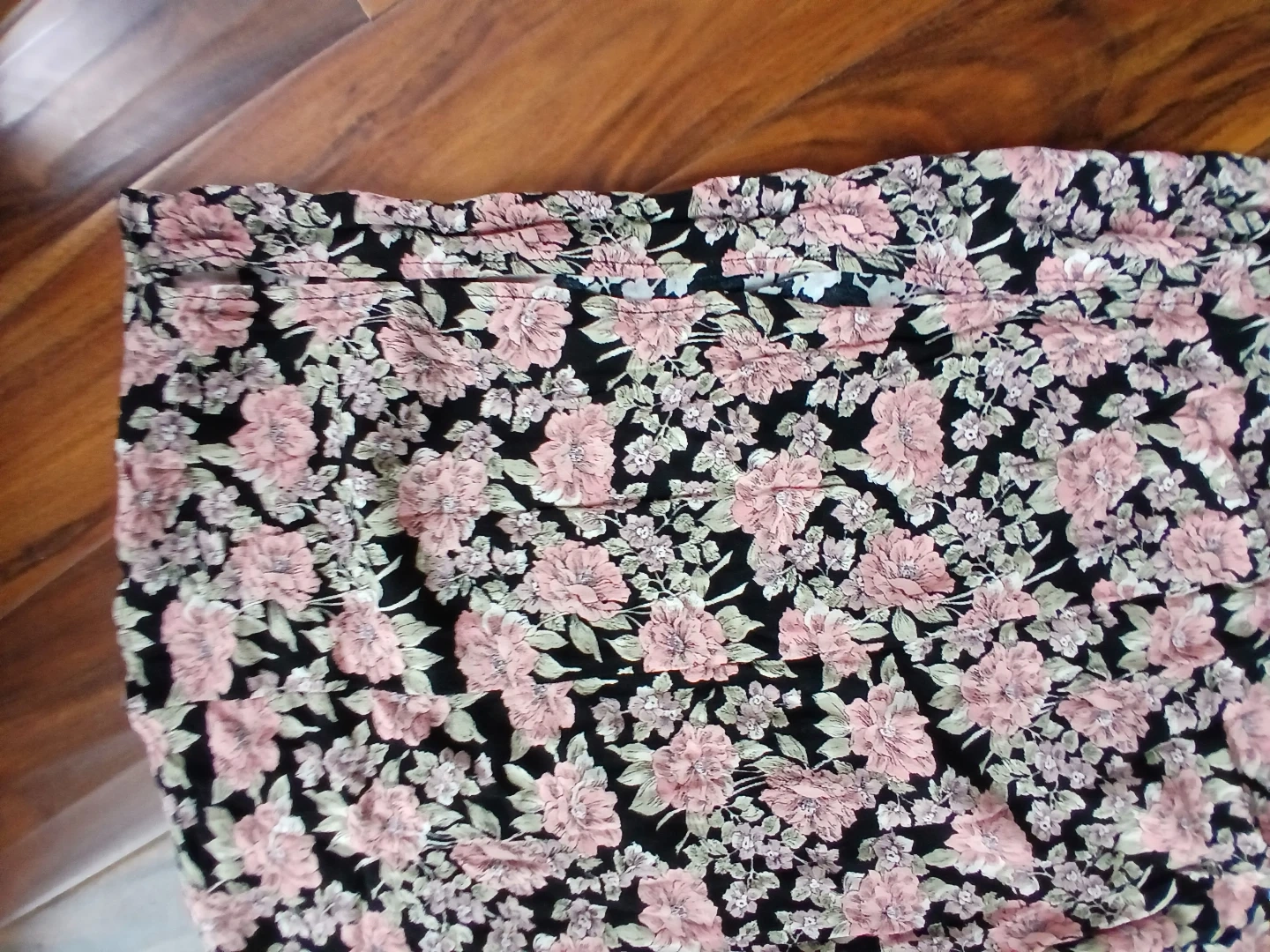 This is an American Eagle Outfitters mini skirt. It's a size XS and made of 100% viscose. The skirt features a black base with a pink and green floral print. It has an elasticated waistband for comfort.