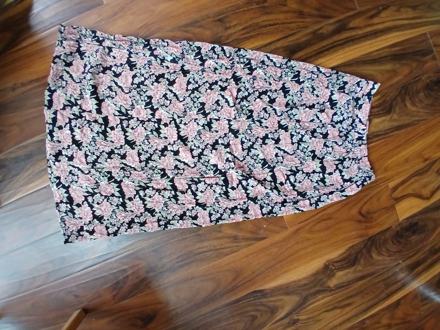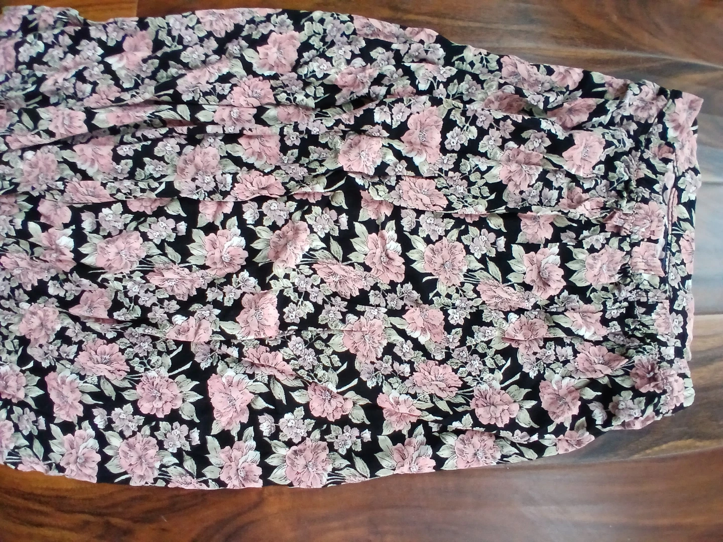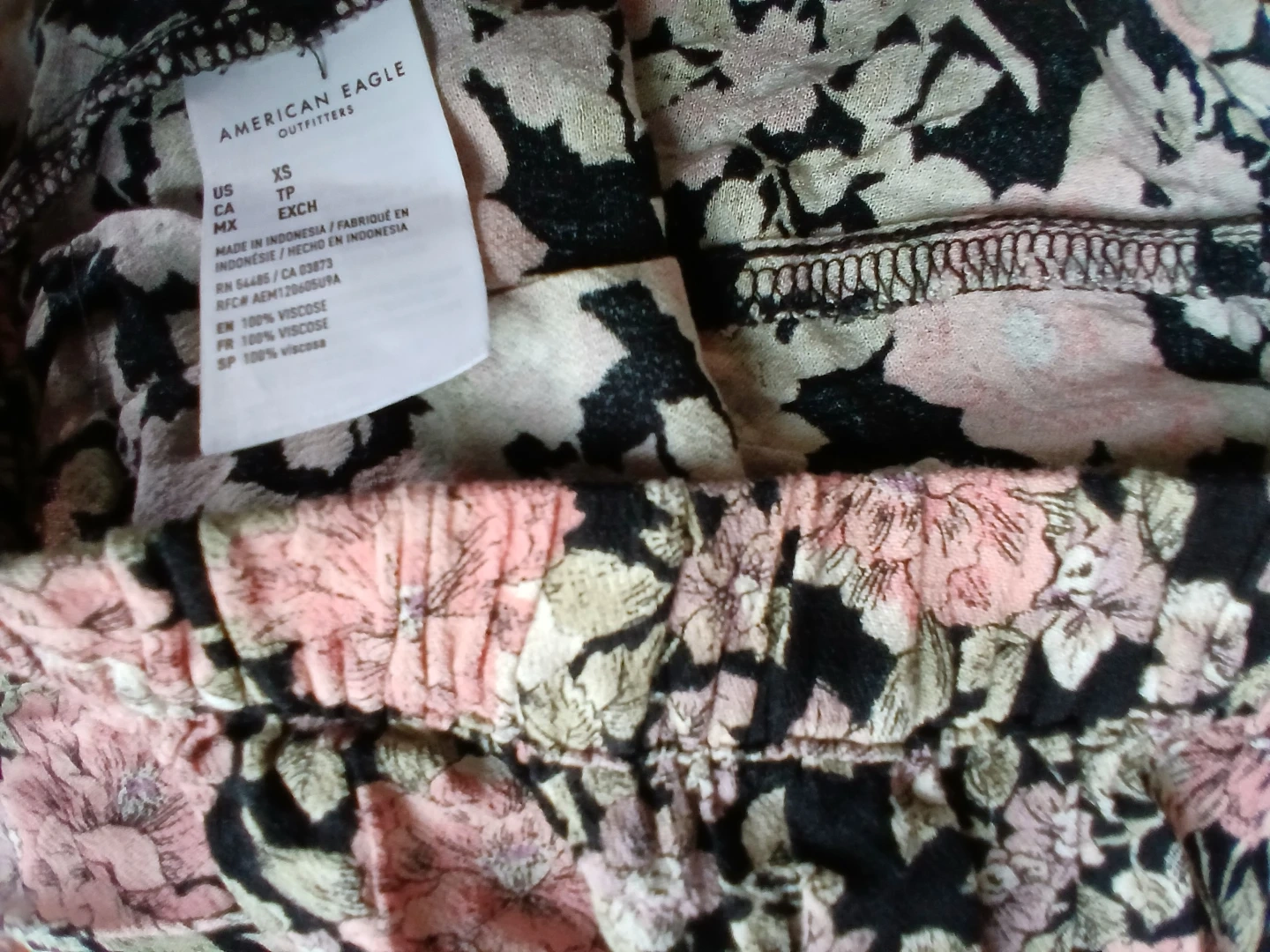 This is an American Eagle Outfitters mini skirt. It's a size XS and made of 100% viscose. The skirt features a black base with a pink and green floral print. It has an elasticated waistband for comfort.