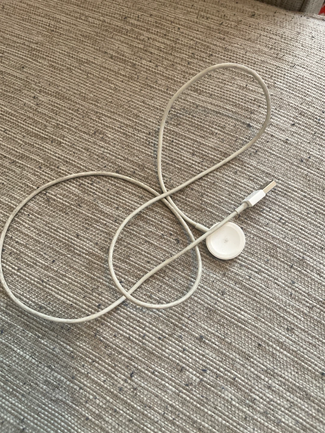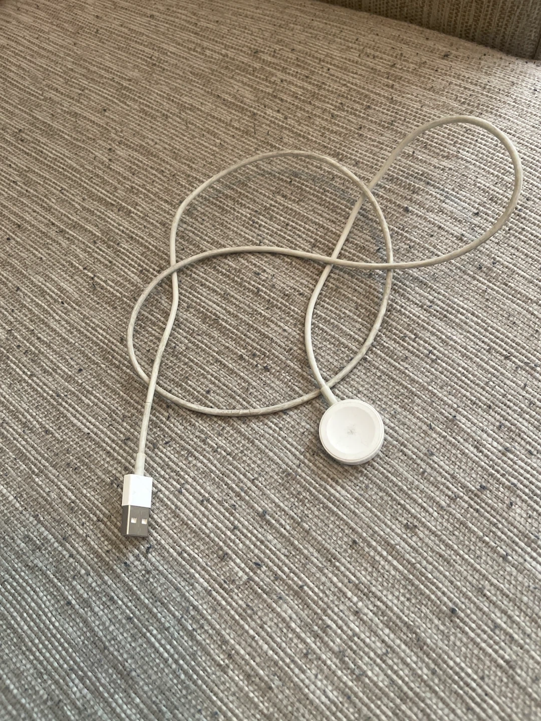 This is a genuine Apple Watch magnetic charging cable. It's a USB-A charger that magnetically snaps onto the back of your Apple Watch. Simply hold the connector near the back of the watch, and magnets will snap it into place.