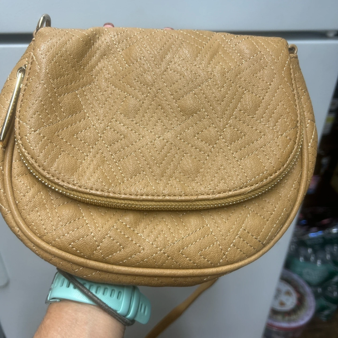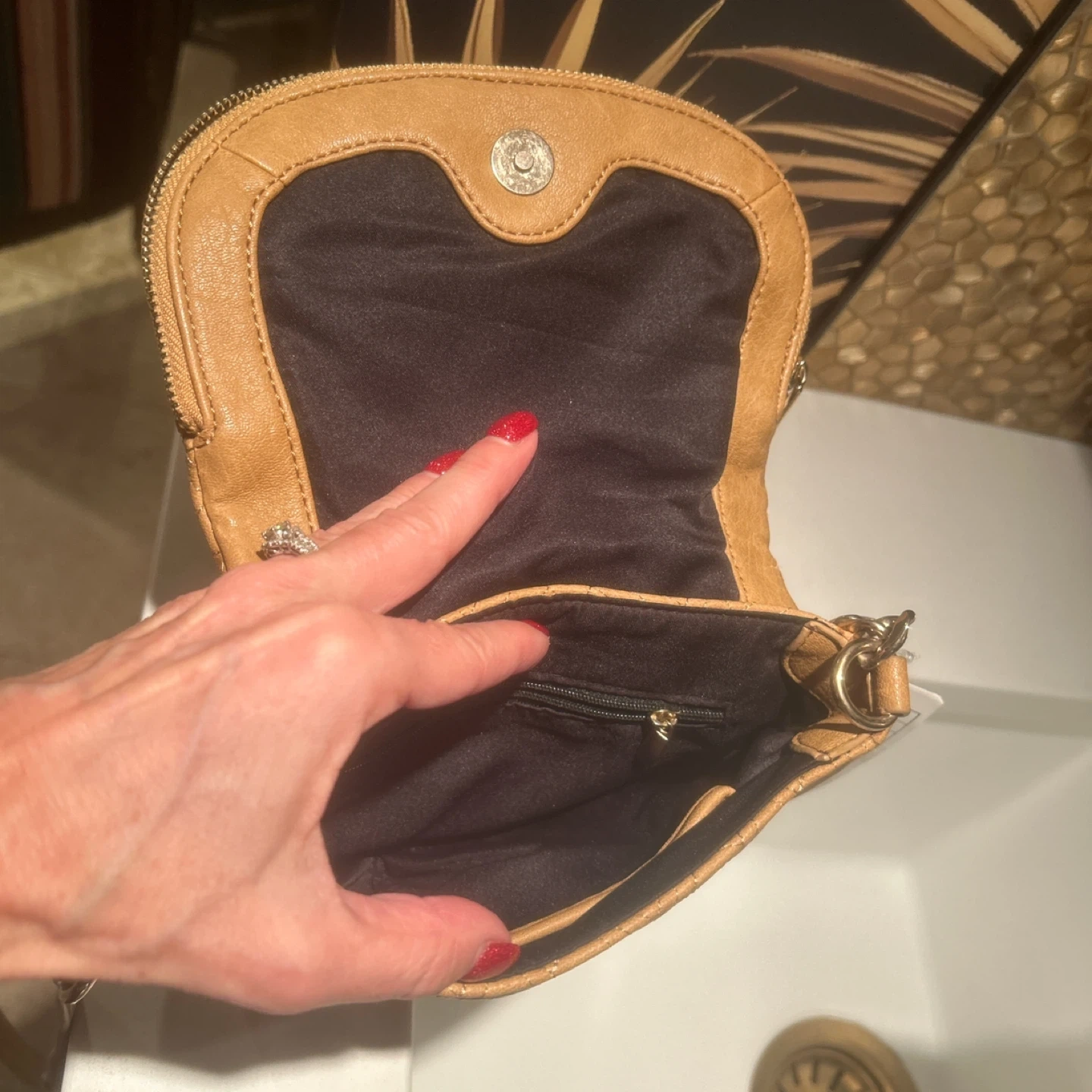 This is a cute Big Buddha crossbody bag in a tan color. Genuine Leather embossed design with sturdy zipper and chain embellishments. NWT never used. Shoulder or crossbody.