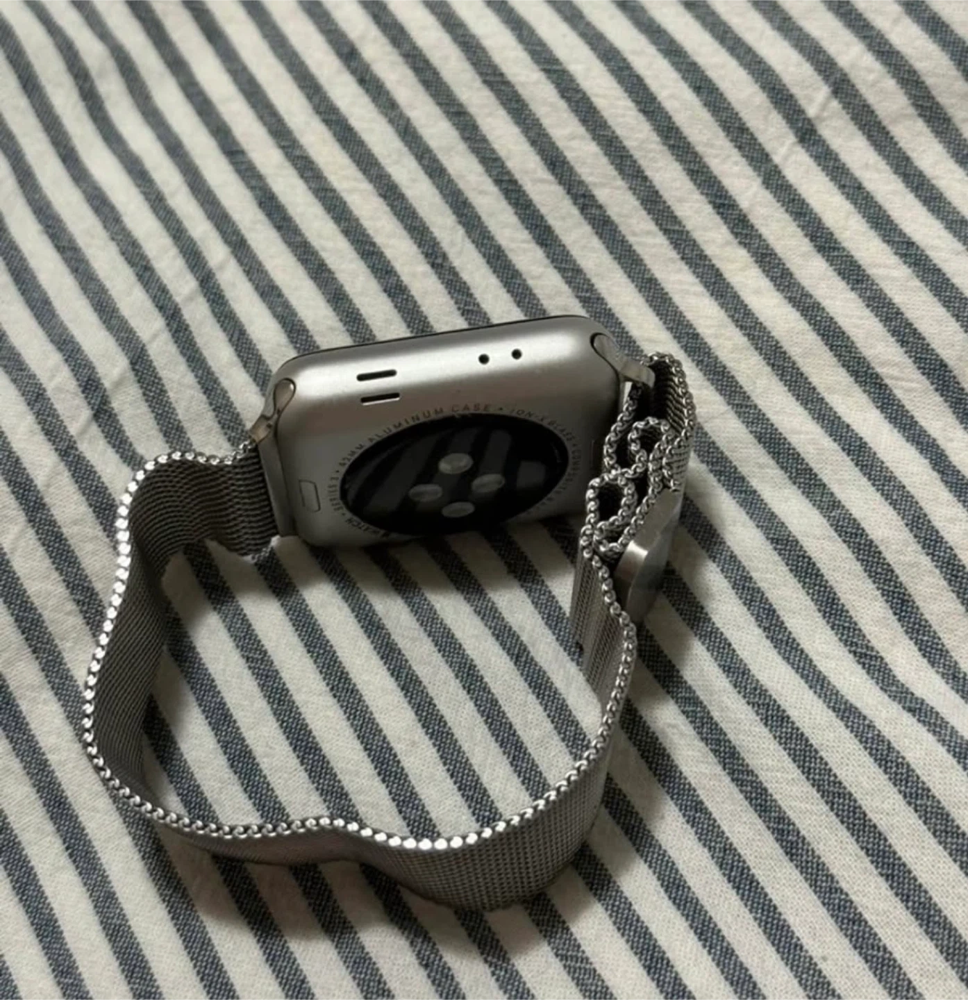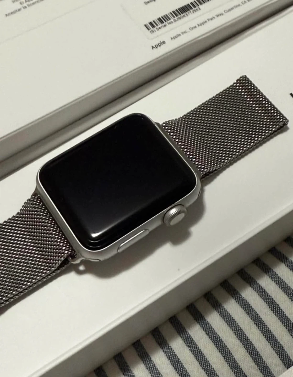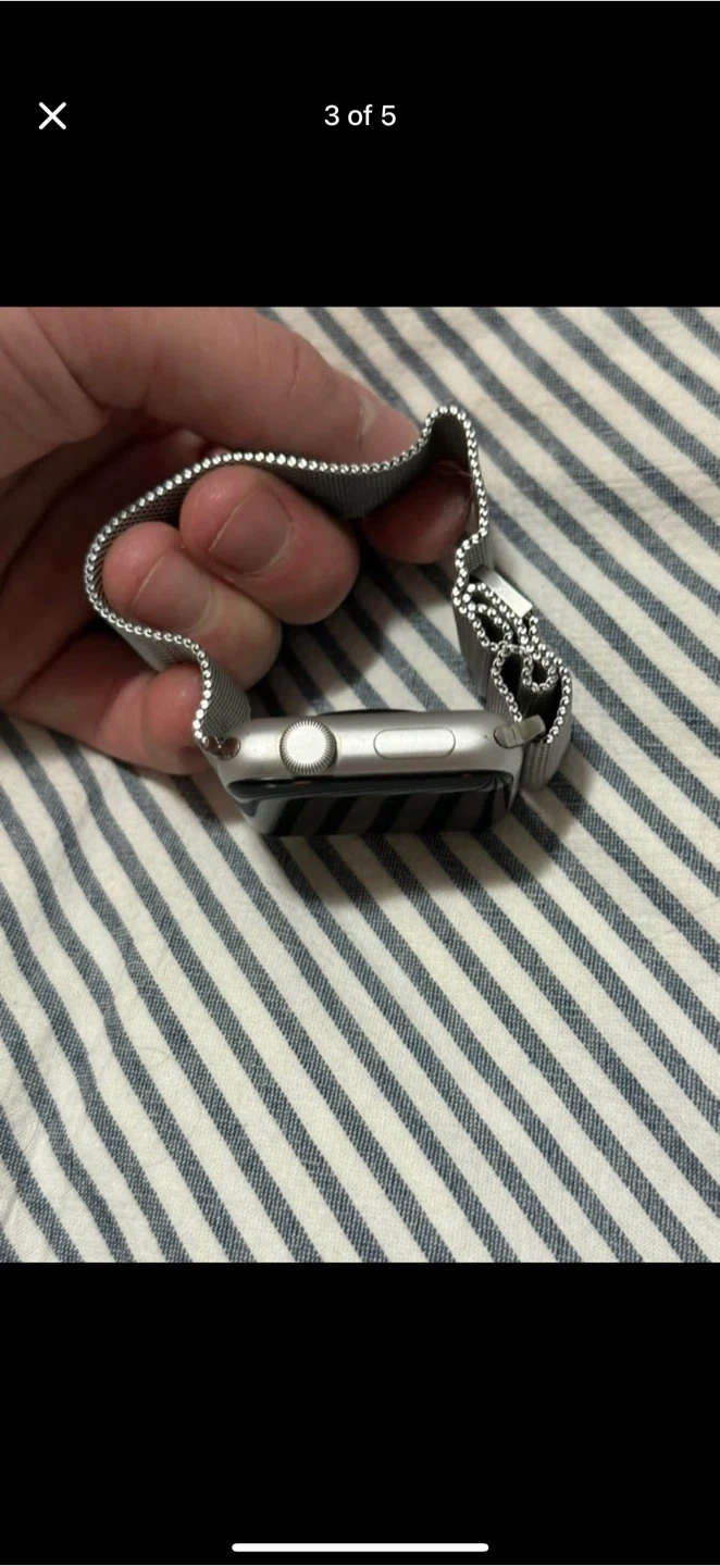 Selling an Apple Watch in silver with a Milanese Loop. The watch is in great condition and comes with the original box. Also included is an additional black band in size 42/44mm. The battery health is at 98%. iOS 8 with GPS. Only been work about 12 times total, basically new