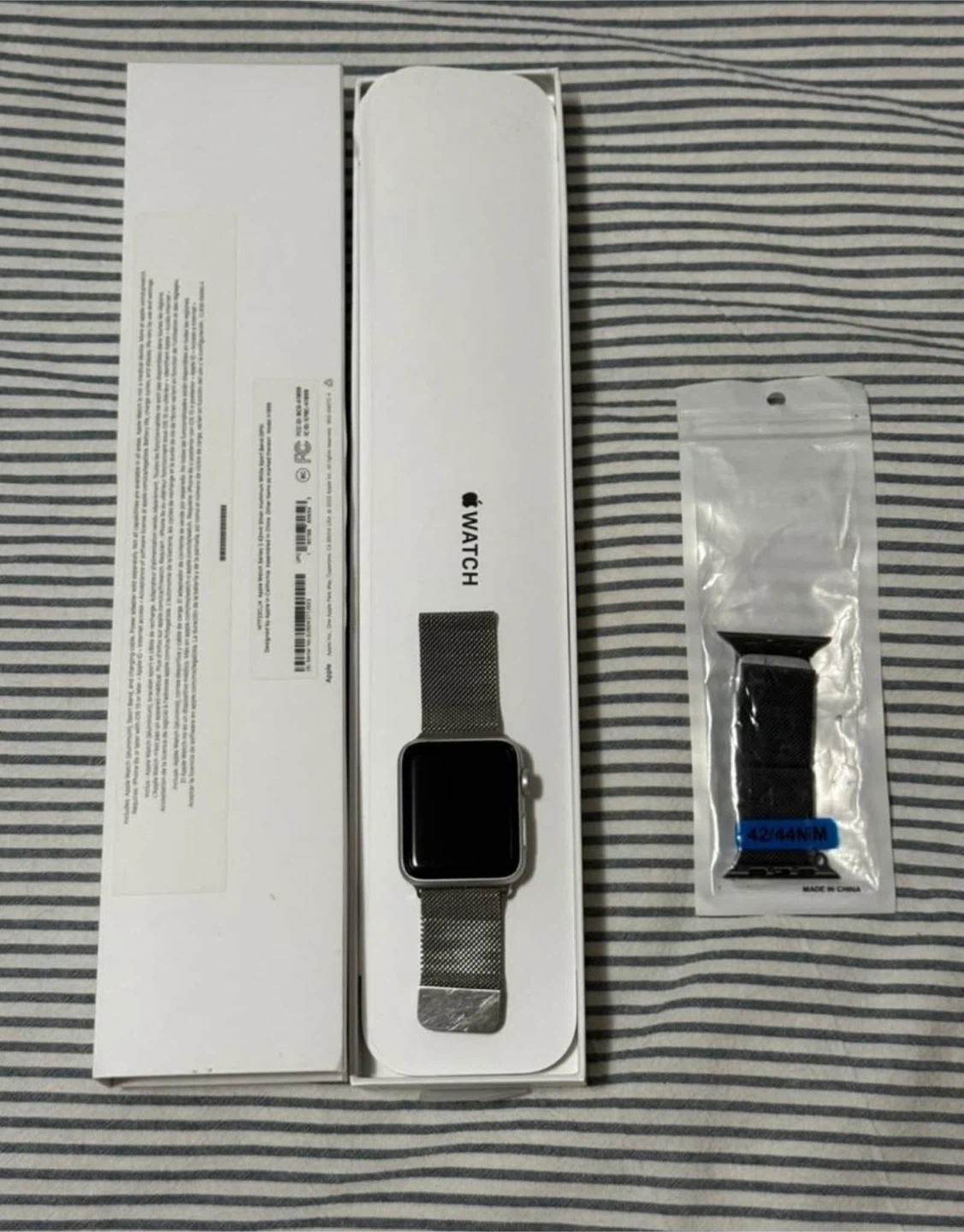 Selling an Apple Watch in silver with a Milanese Loop. The watch is in great condition and comes with the original box. Also included is an additional black band in size 42/44mm. The battery health is at 98%. iOS 8 with GPS. Only been work about 12 times total, basically new