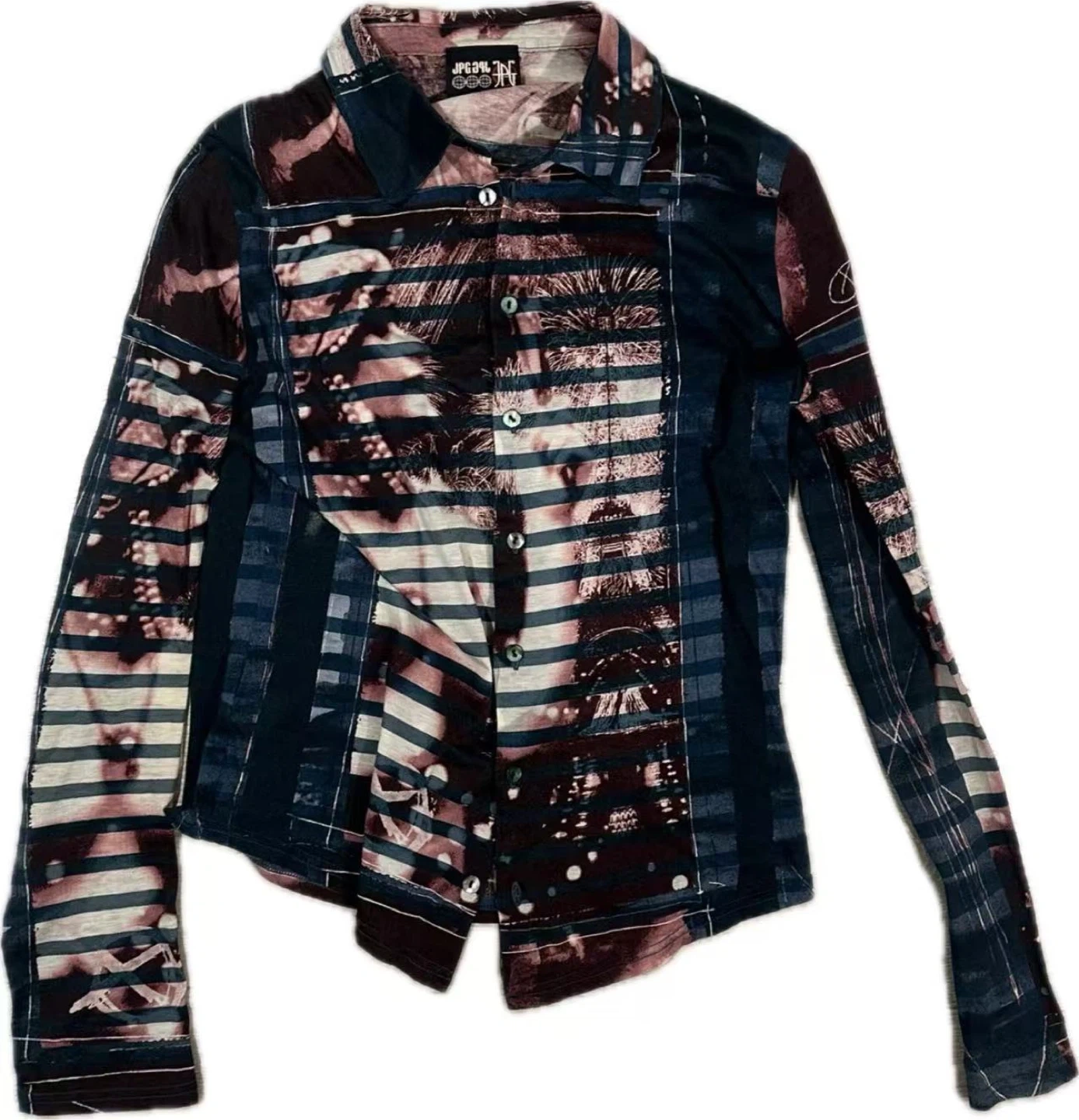 JPG by Jean Paul Gaultier long-sleeve button-up shirt with a unique all-over print of Paris night views fireworks and Eiffel Tower. It's a size medium. This shirt features a button-up front and a collared neckline.