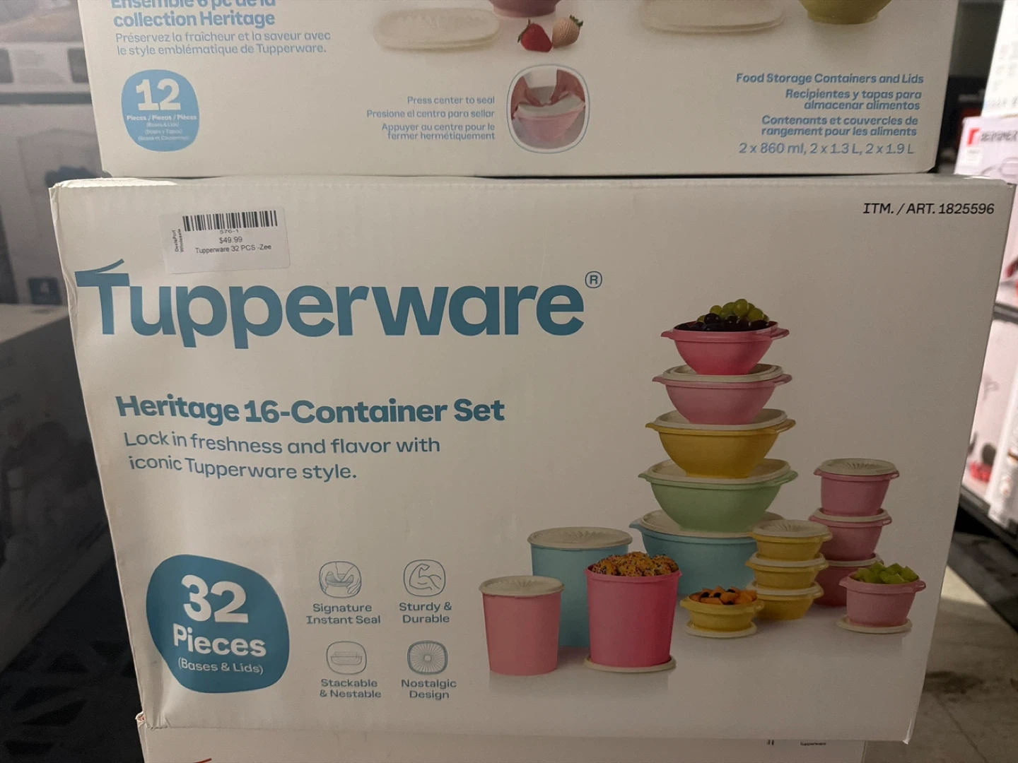 This is a Tupperware Heritage 16-Container Set with 32 pieces, including bases and lids. It features a signature instant seal and is stackable and nestable. The containers are sturdy and durable, designed with a nostalgic look.