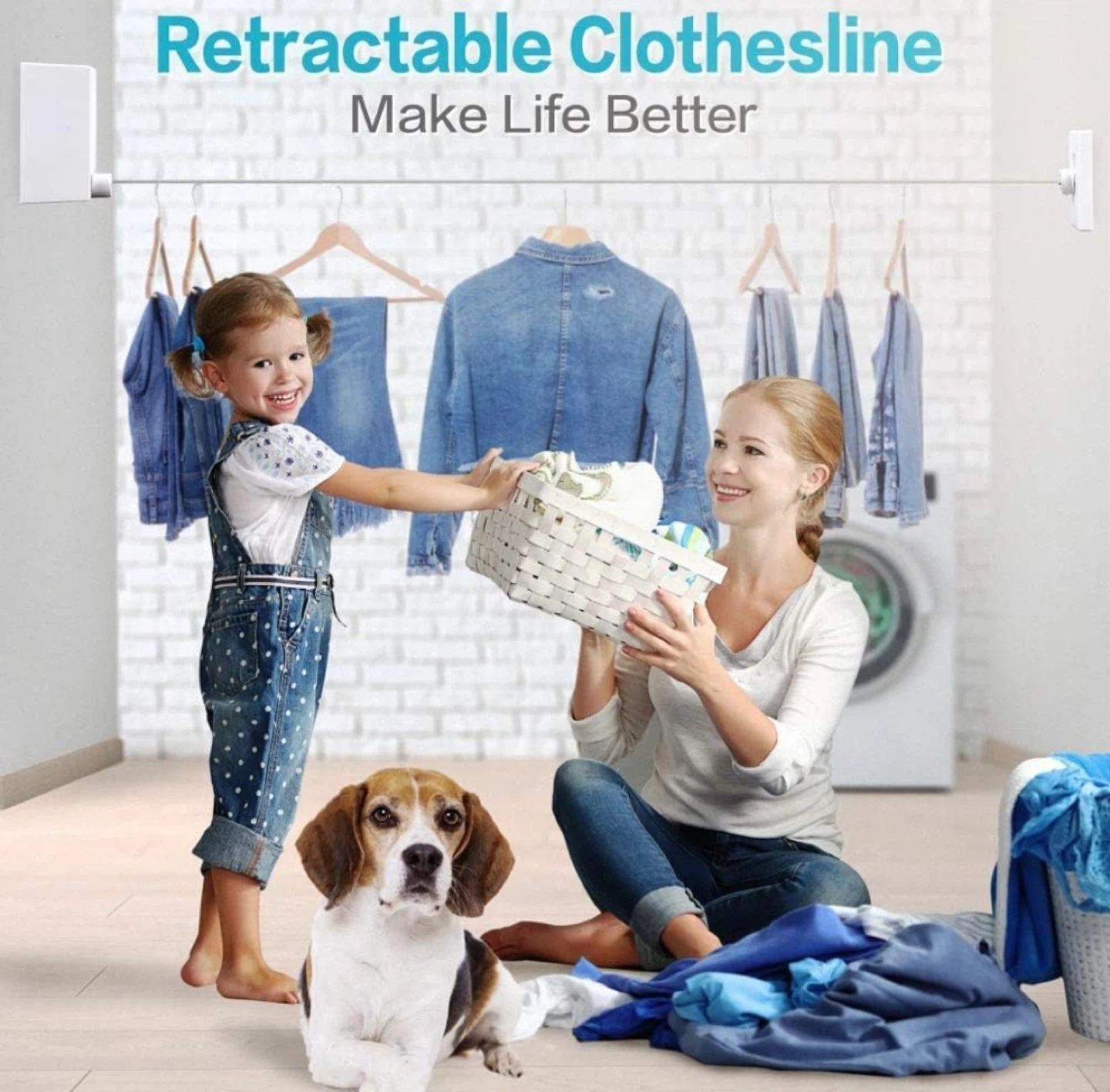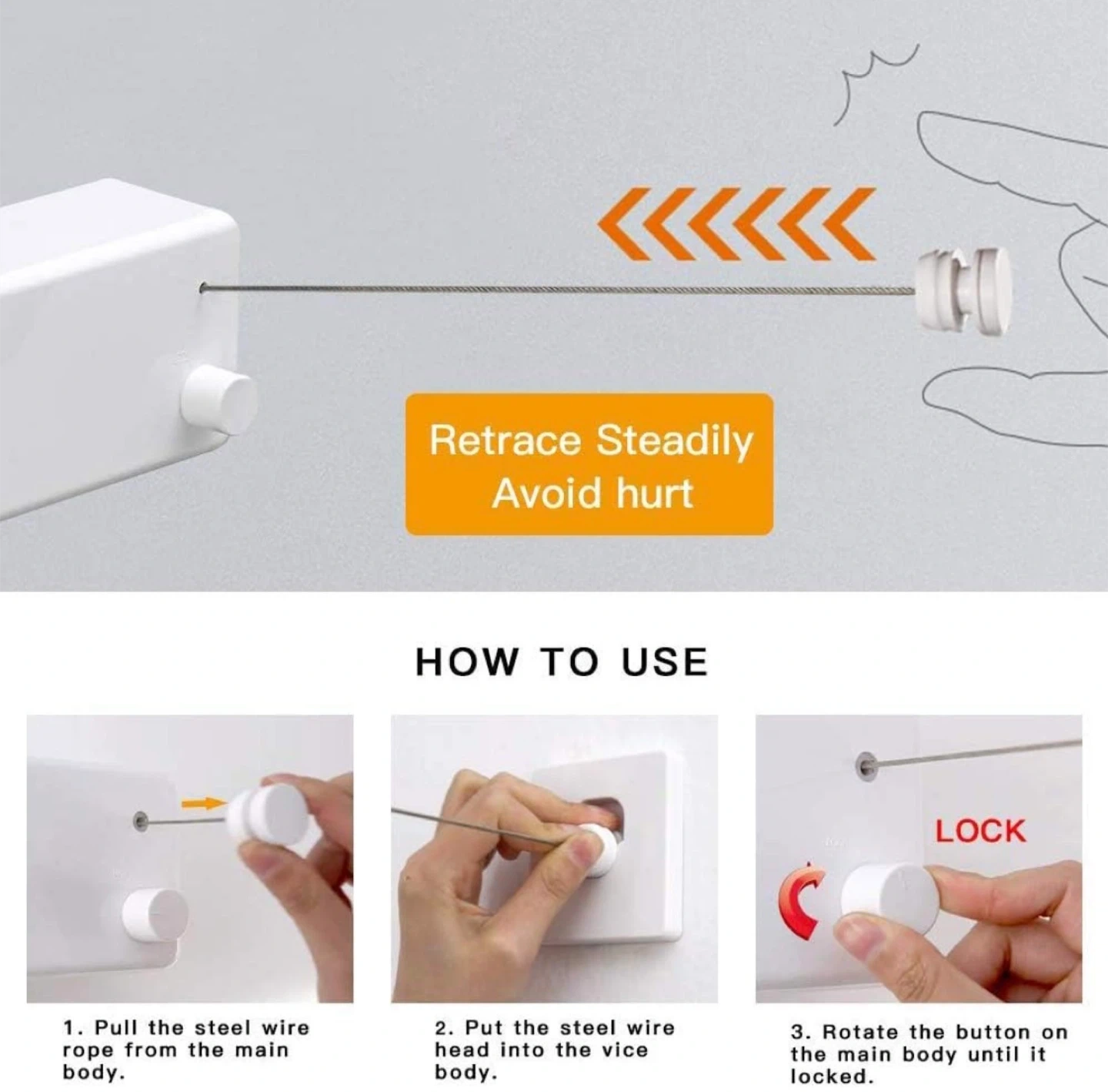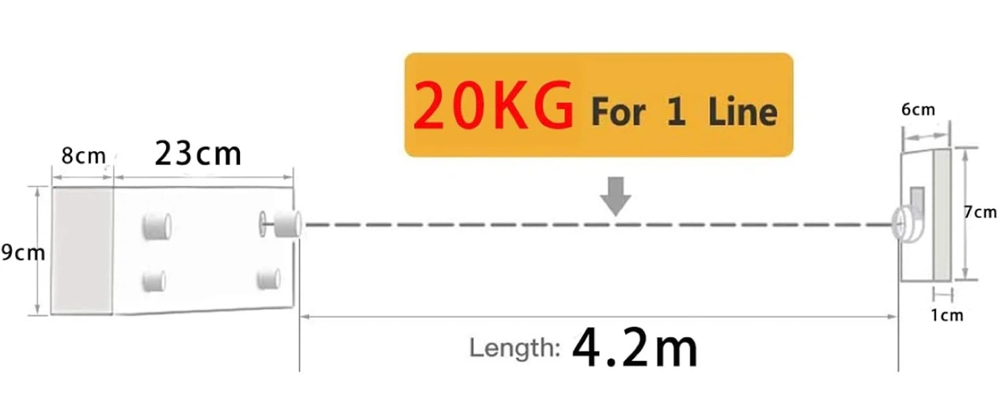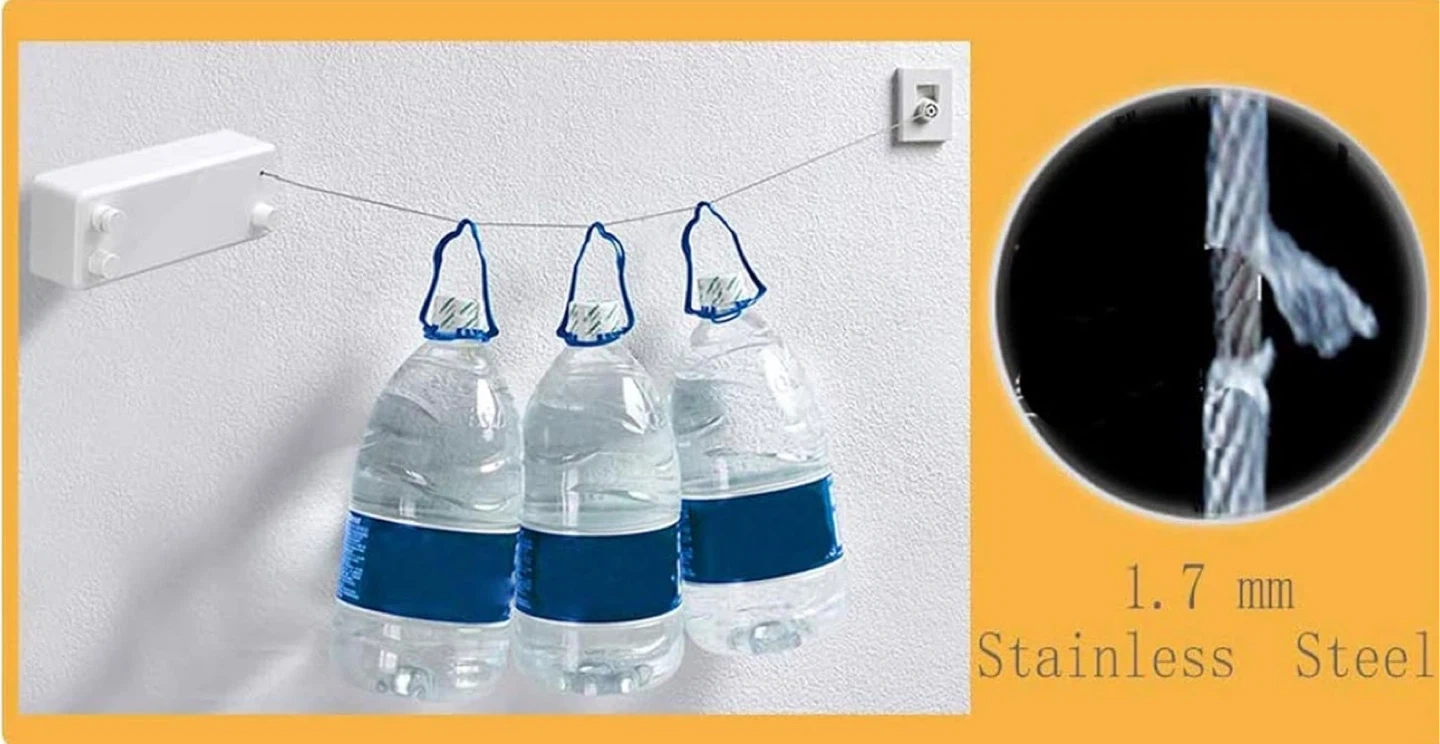 This retractable clothesline extends up to 4.2 meters. It's made from durable 1.7 mm stainless steel and has a load-bearing capacity of 20KG. The line retracts steadily to avoid injury.