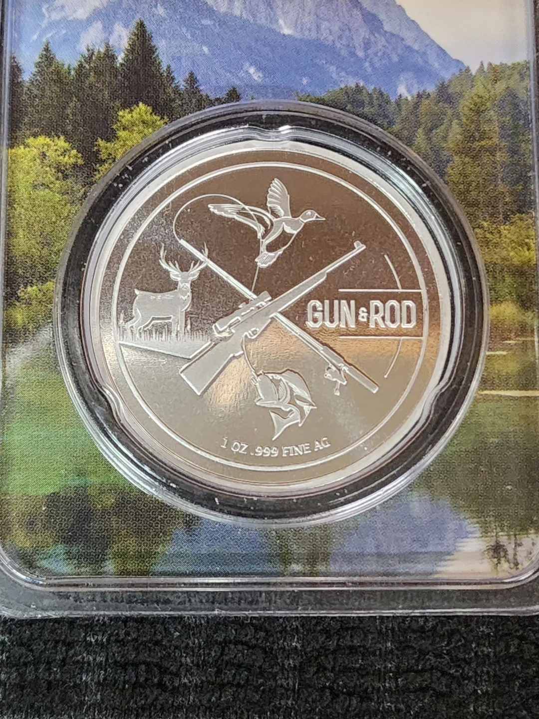 Selling a Gun & Rod .999 fine silver coin! It's in great condition and comes in its original packaging. Features a detailed design with a duck, deer, and rifle. A unique piece for collectors!