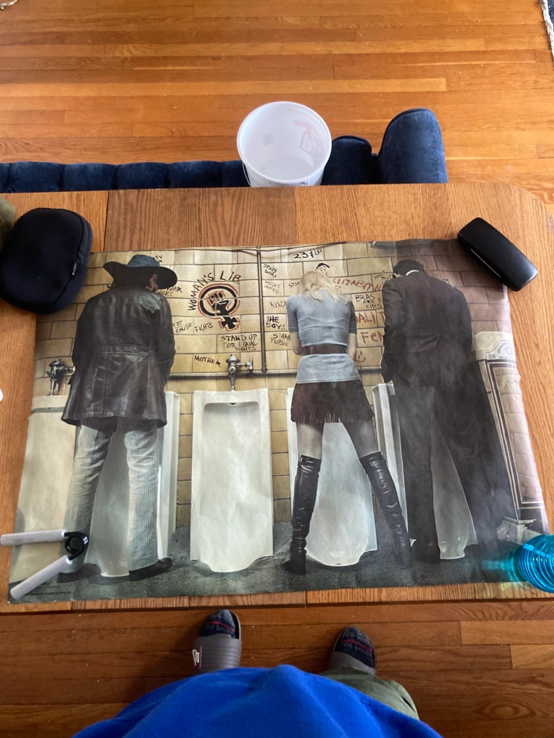 Poster featuring artwork titled "Woman's Lib" with three figures in a restroom setting. Text includes "Stand Up For Equal Rights". Measures approximately 24x36 inches. Paper material.