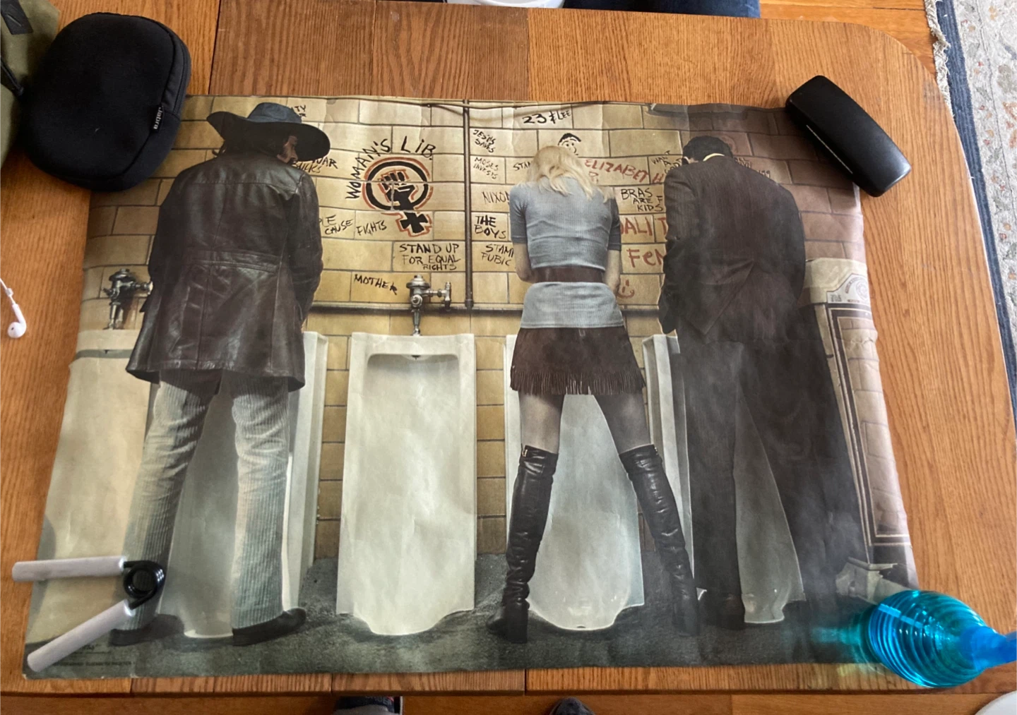 Poster featuring artwork titled "Woman's Lib" with three figures in a restroom setting. Text includes "Stand Up For Equal Rights". Measures approximately 24x36 inches. Paper material.