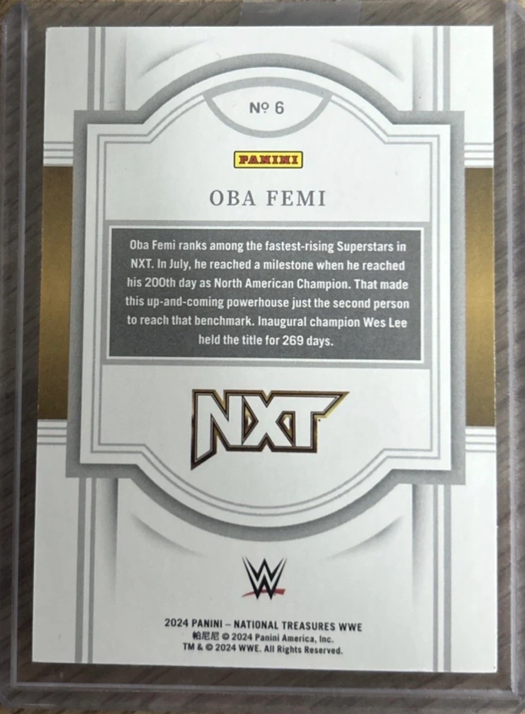 This is a 2024 Panini National Treasures WWE trading card featuring Oba Femi. It's his rookie card and is numbered 53 out of 99. The card details his career milestones within NXT.