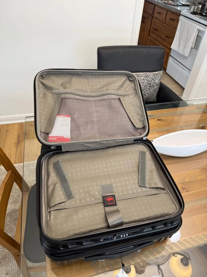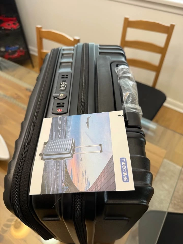 This is a TydeCkare 16" carry-on suitcase, perfect for business travel. It's a lightweight hardshell made from ABS+PC material and features two compartments for laptops. It also has a dual-control TSA lock, YKK zipper, and four silent spinner wheels. The color is black.