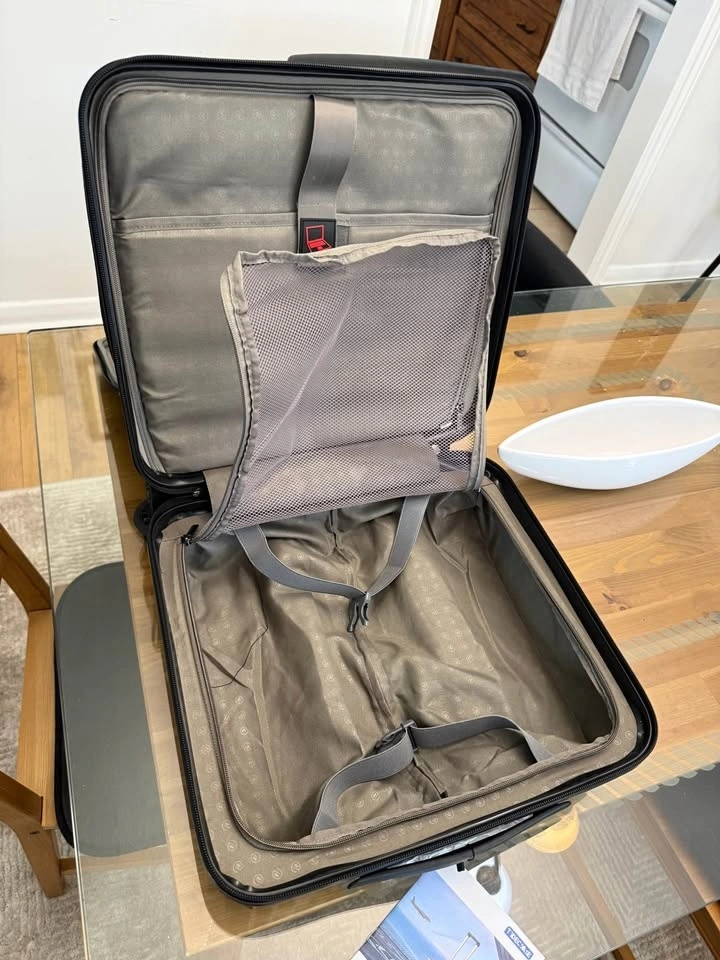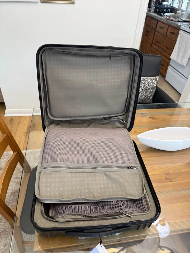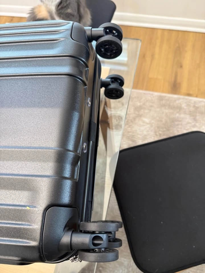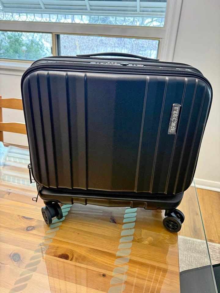 This is a TydeCkare 16" carry-on suitcase, perfect for business travel. It's a lightweight hardshell made from ABS+PC material and features two compartments for laptops. It also has a dual-control TSA lock, YKK zipper, and four silent spinner wheels. The color is black.