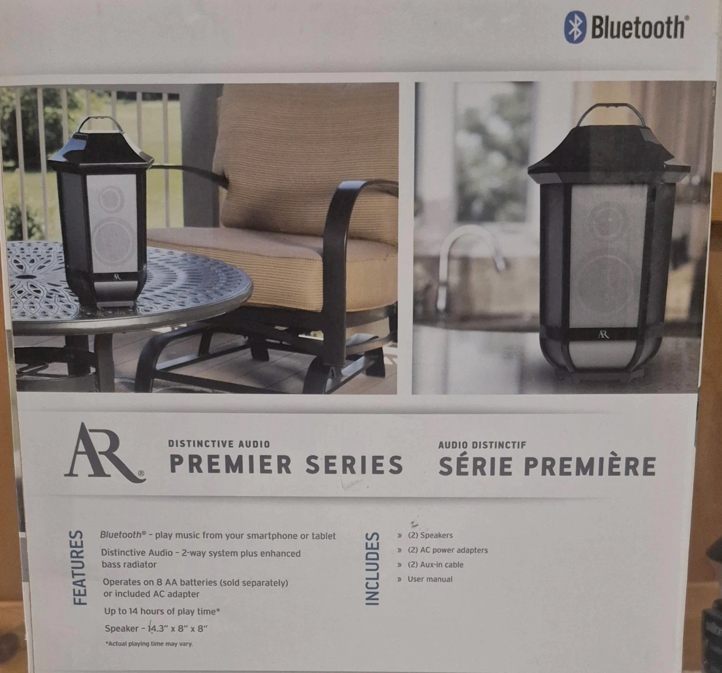 Bluetooth wireless speakers from AR's Premier Series. Distinctive Audio 2-way system with enhanced bass radiator. Operates on 8 AA batteries or included AC adapter, offering up to 14 hours of play time.