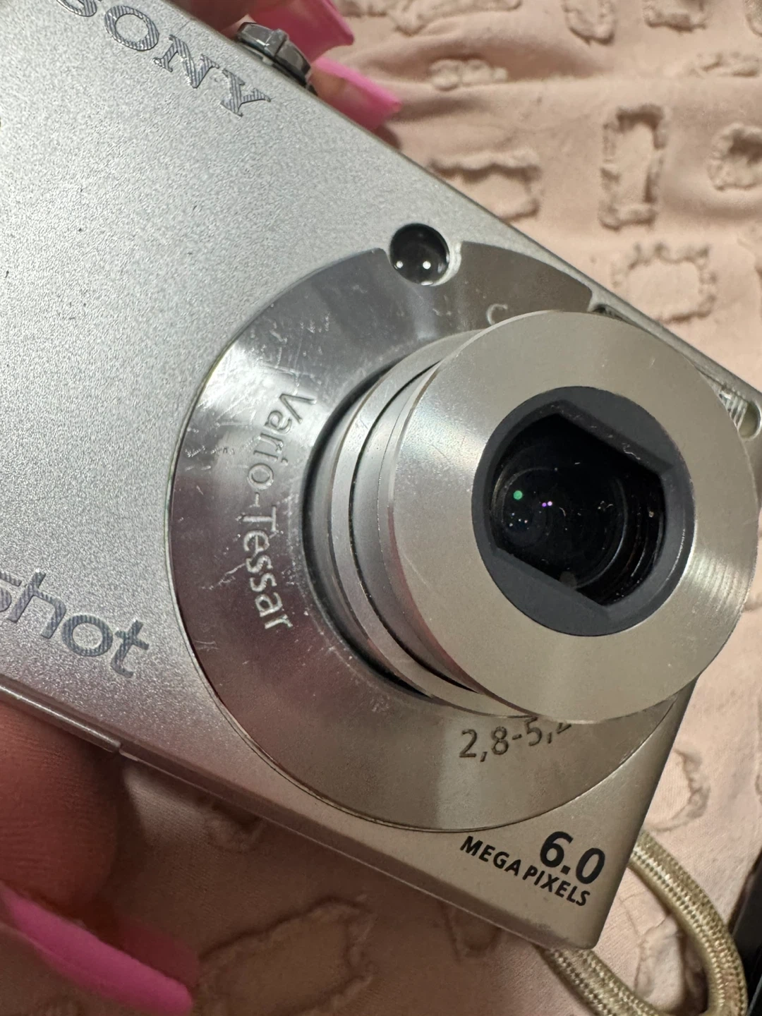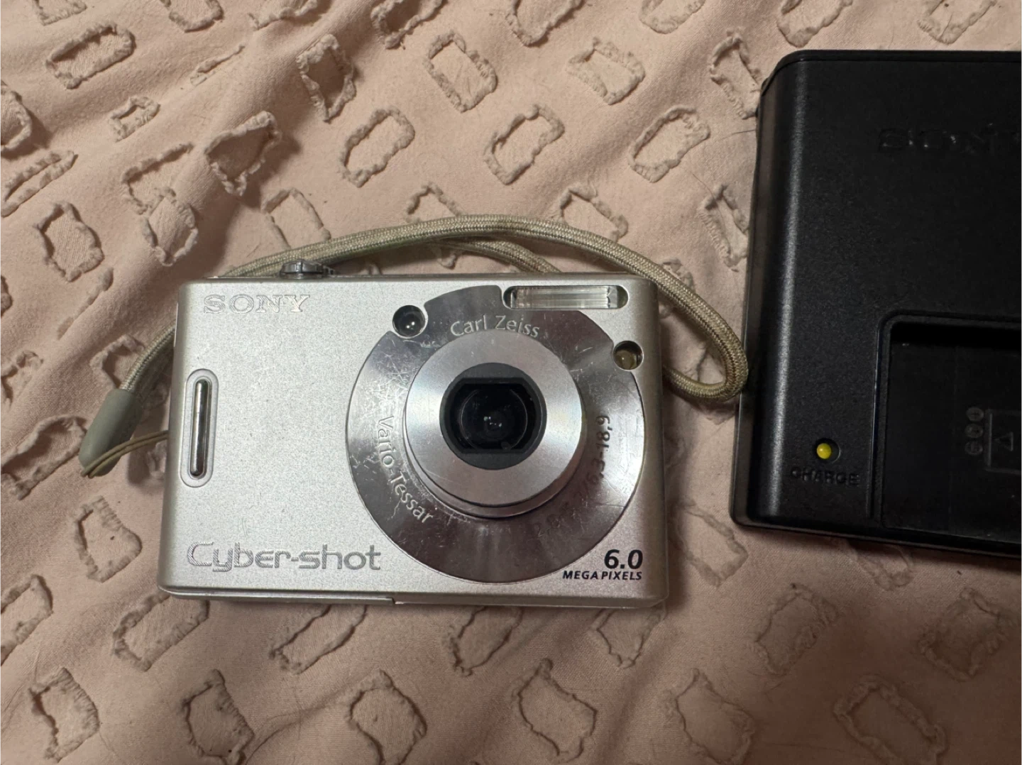 This is a silver Sony Cyber-shot DSC-W30 digital camera. It features a 6.0 megapixel Carl Zeiss Vario-Tessar lens. It comes with a charger and battery.