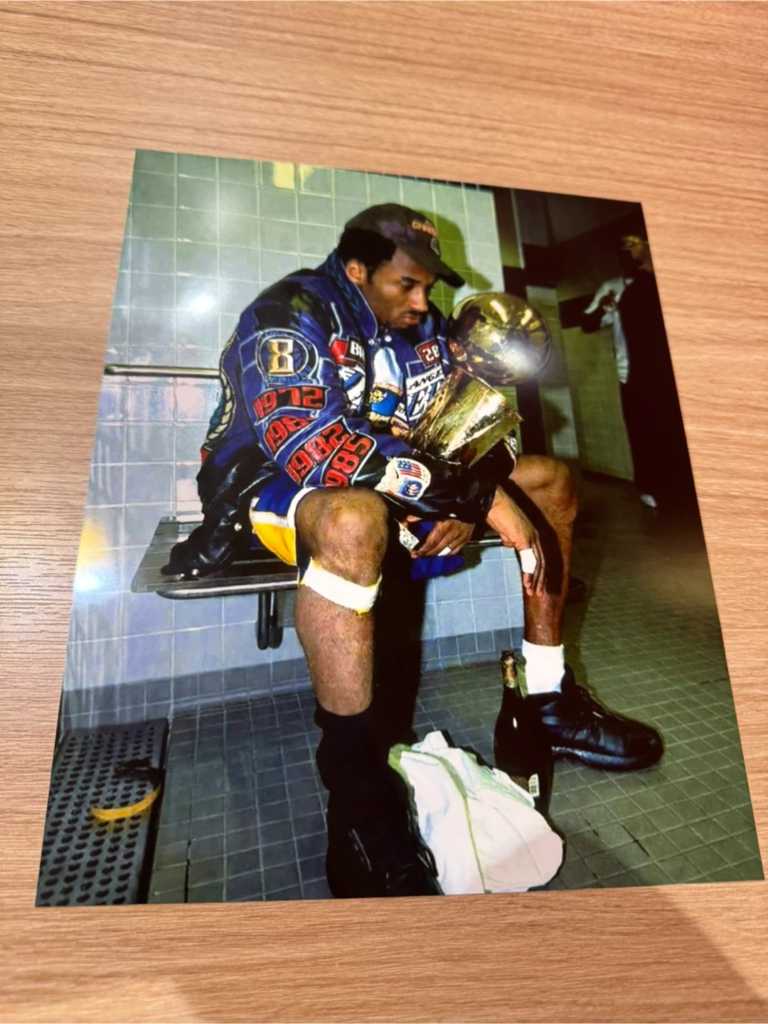This is a photo print featuring Kobe Bryant holding a championship trophy. It captures a celebratory moment. The print is of good quality. 8x10