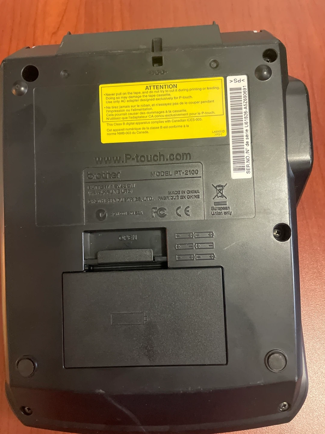 Brother P-Touch PT-2100 label maker. It's a portable electronic label printer. Supports 18mm laminated tape.