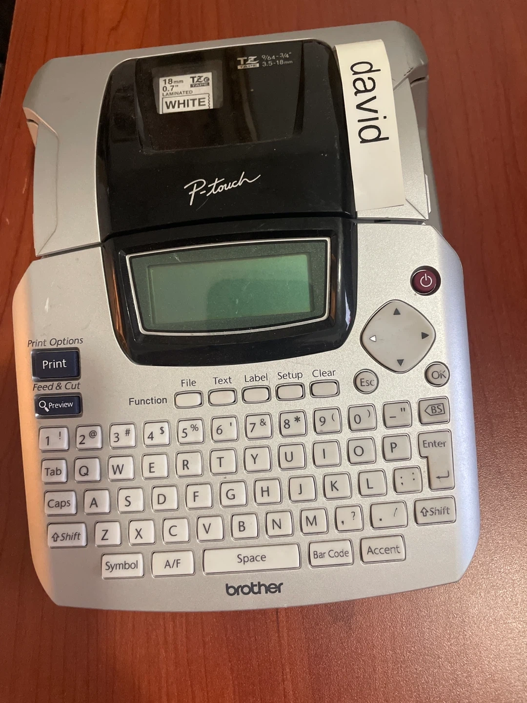 Brother P-Touch PT-2100 label maker. It's a portable electronic label printer. Supports 18mm laminated tape.