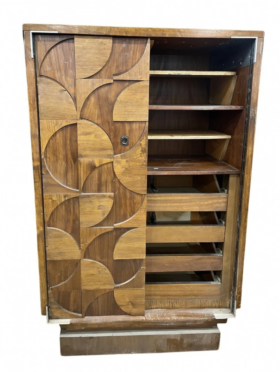 Free four piece set. Two side tables, a long dresser with 9 drawers and a tall dresser with drawers and shelves. The door was taken off but I have it on the side. It can be put back with the tight hardware.
