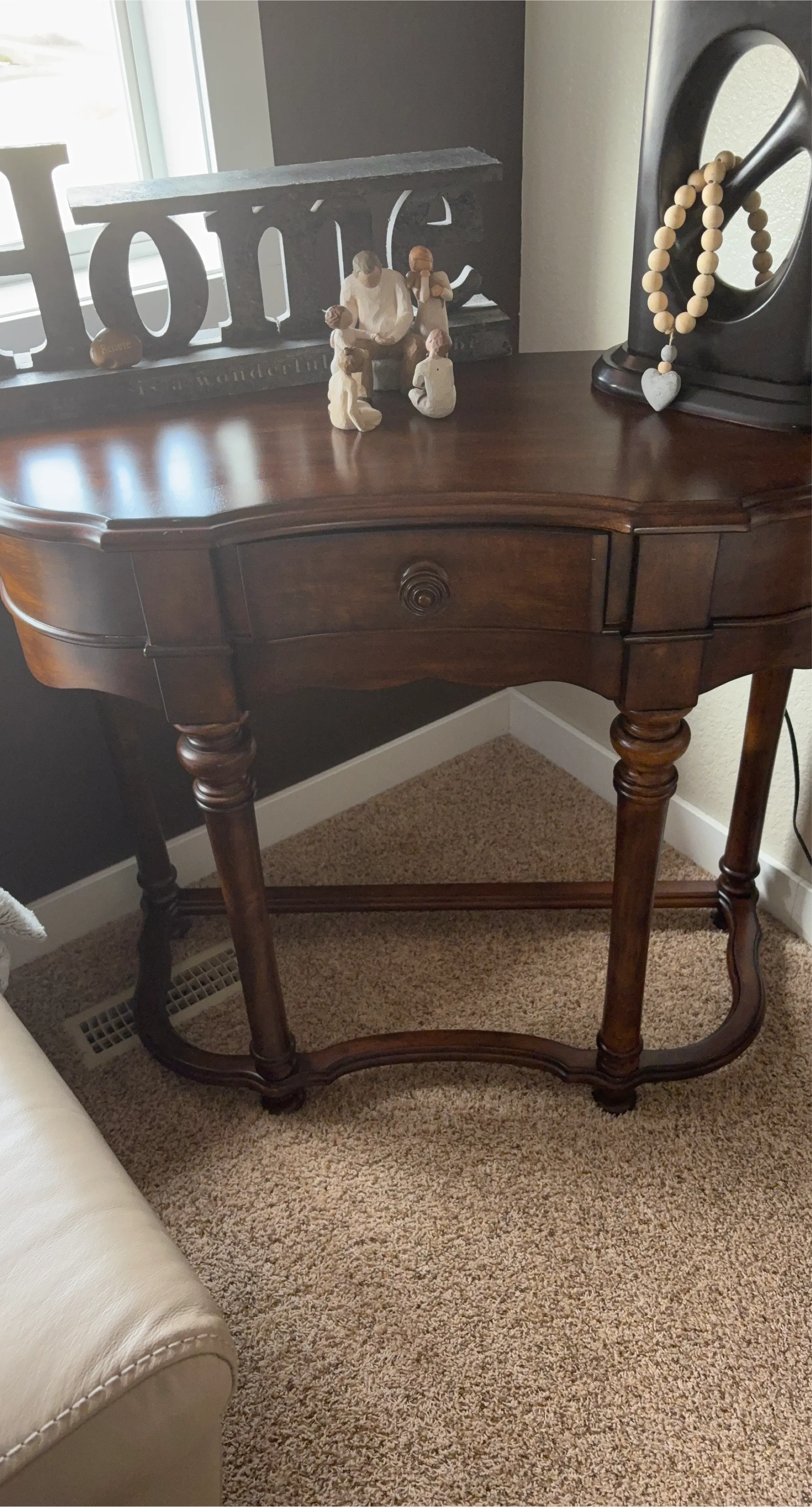 A lovely dark wood console table with a single drawer and carved details. Its elegant design makes it a charming addition to any entryway or living space. The curved legs and decorative pull add a touch of vintage appeal.