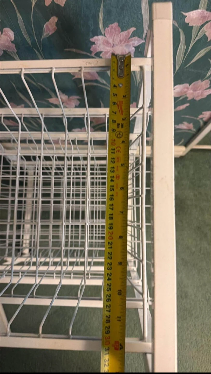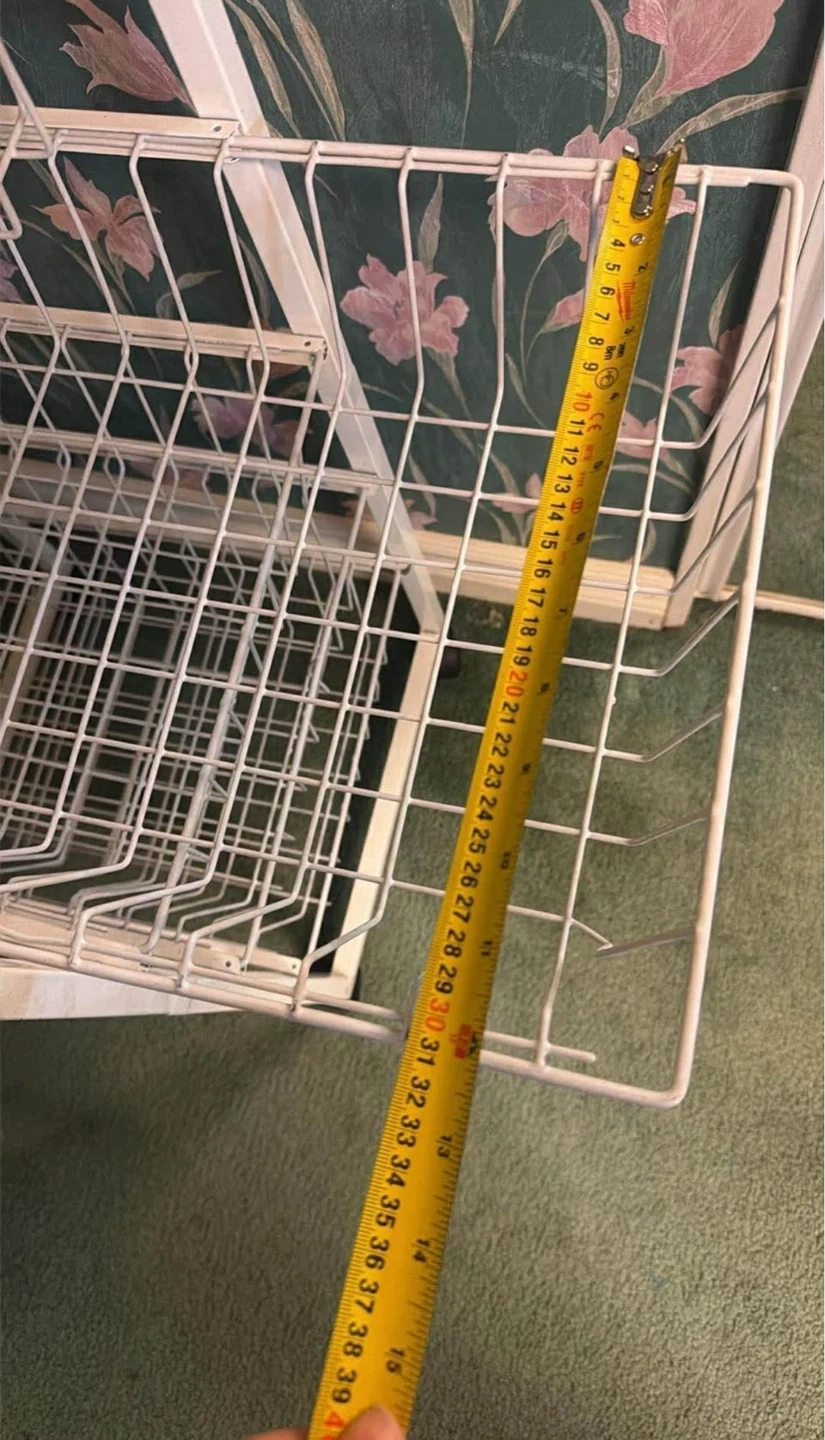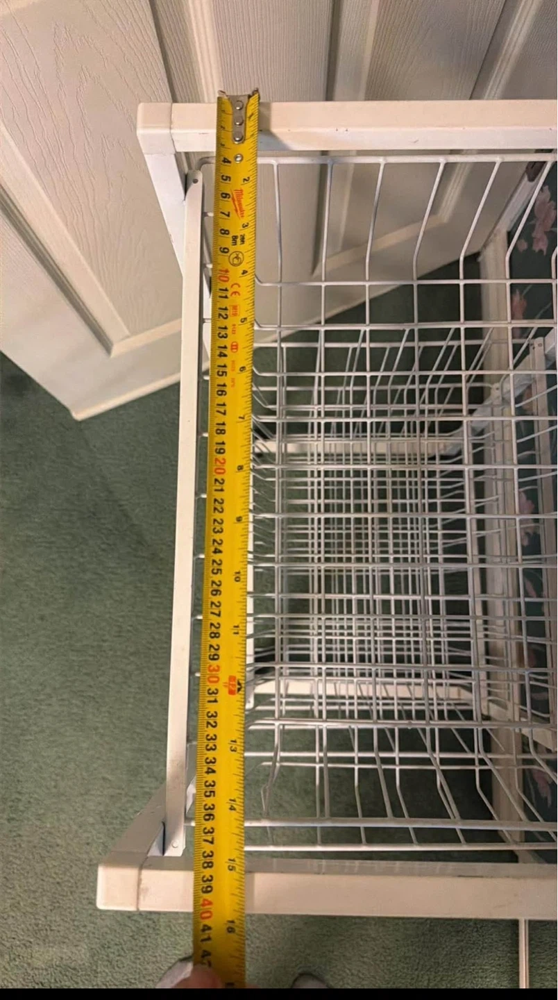 A white wire rolling cart with four tiers. It has a metal construction and measures approximately 39 inches tall. It's great for organizing produce or general storage!