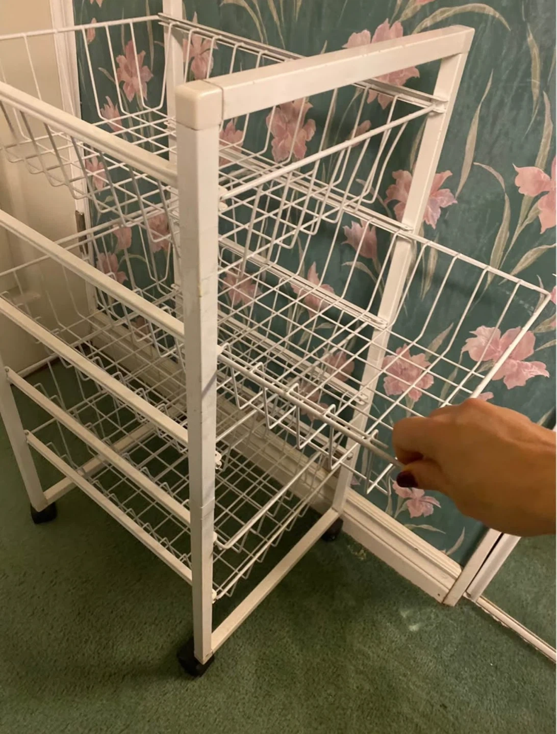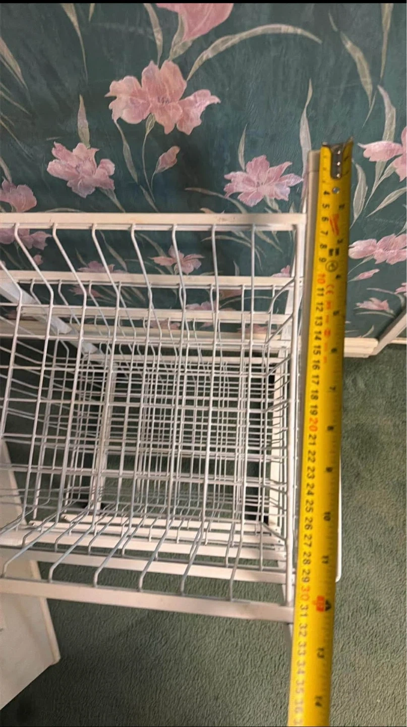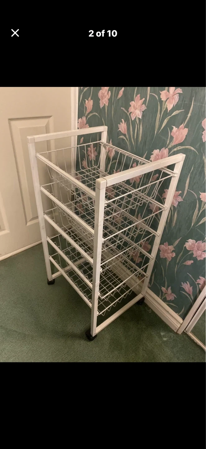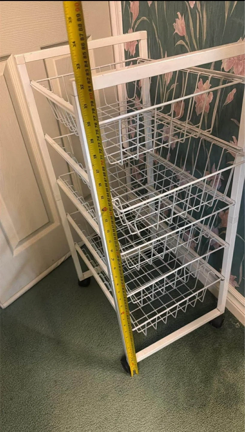 A white wire rolling cart with four tiers. It has a metal construction and measures approximately 39 inches tall. It's great for organizing produce or general storage!