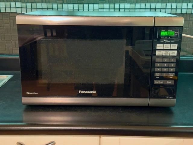 The black and stainless steel finish of this mid-sized microwave fits any modern kitchen. It has Panasonic's Inverter technology for even heating, and Genius Sensor for easy cooking and reheating. As you can see in the pictures, it is clean and undamaged inside and out. The glass plate is undamaged and rotates properly when the microwave is in use. Cash accepted.