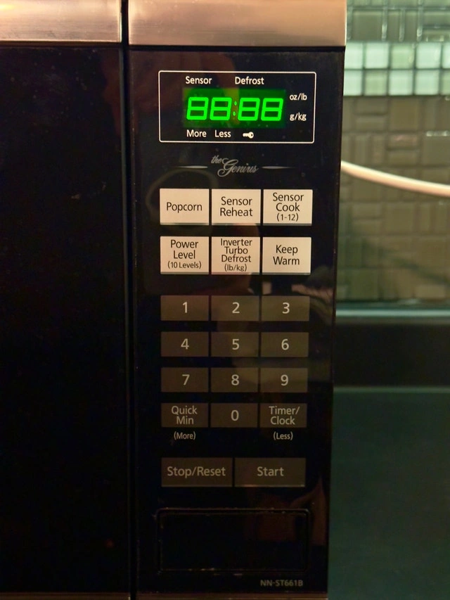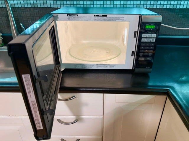 The black and stainless steel finish of this mid-sized microwave fits any modern kitchen. It has Panasonic's Inverter technology for even heating, and Genius Sensor for easy cooking and reheating. As you can see in the pictures, it is clean and undamaged inside and out. The glass plate is undamaged and rotates properly when the microwave is in use. Cash accepted.