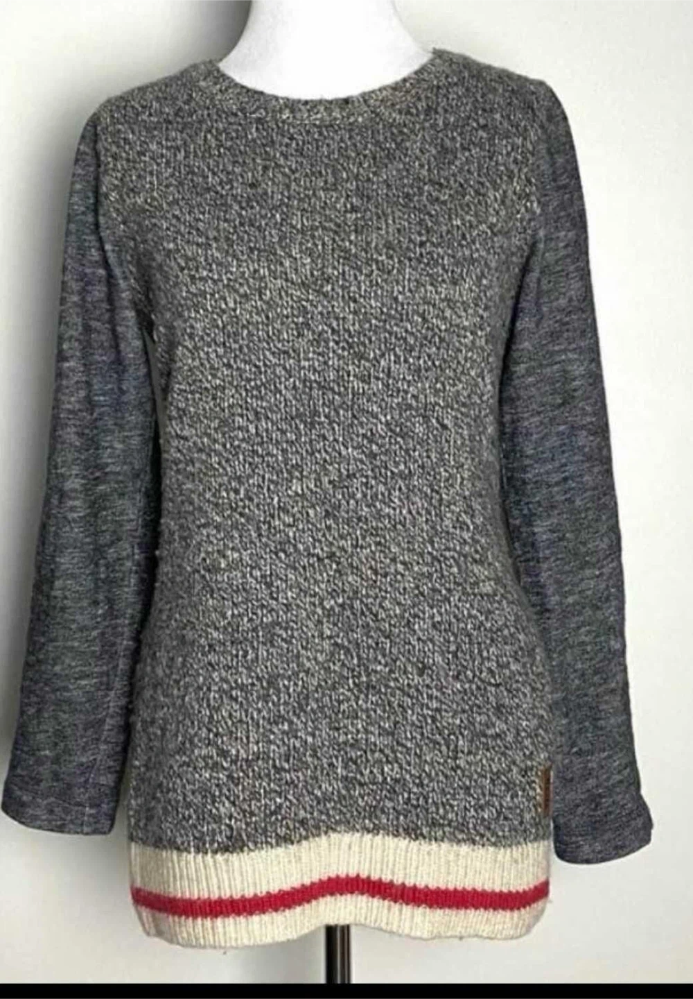 This cozy knit sweater features a marled grey body and a contrast hem with cream and red stripes. It's a comfortable and stylish piece for cooler weather.