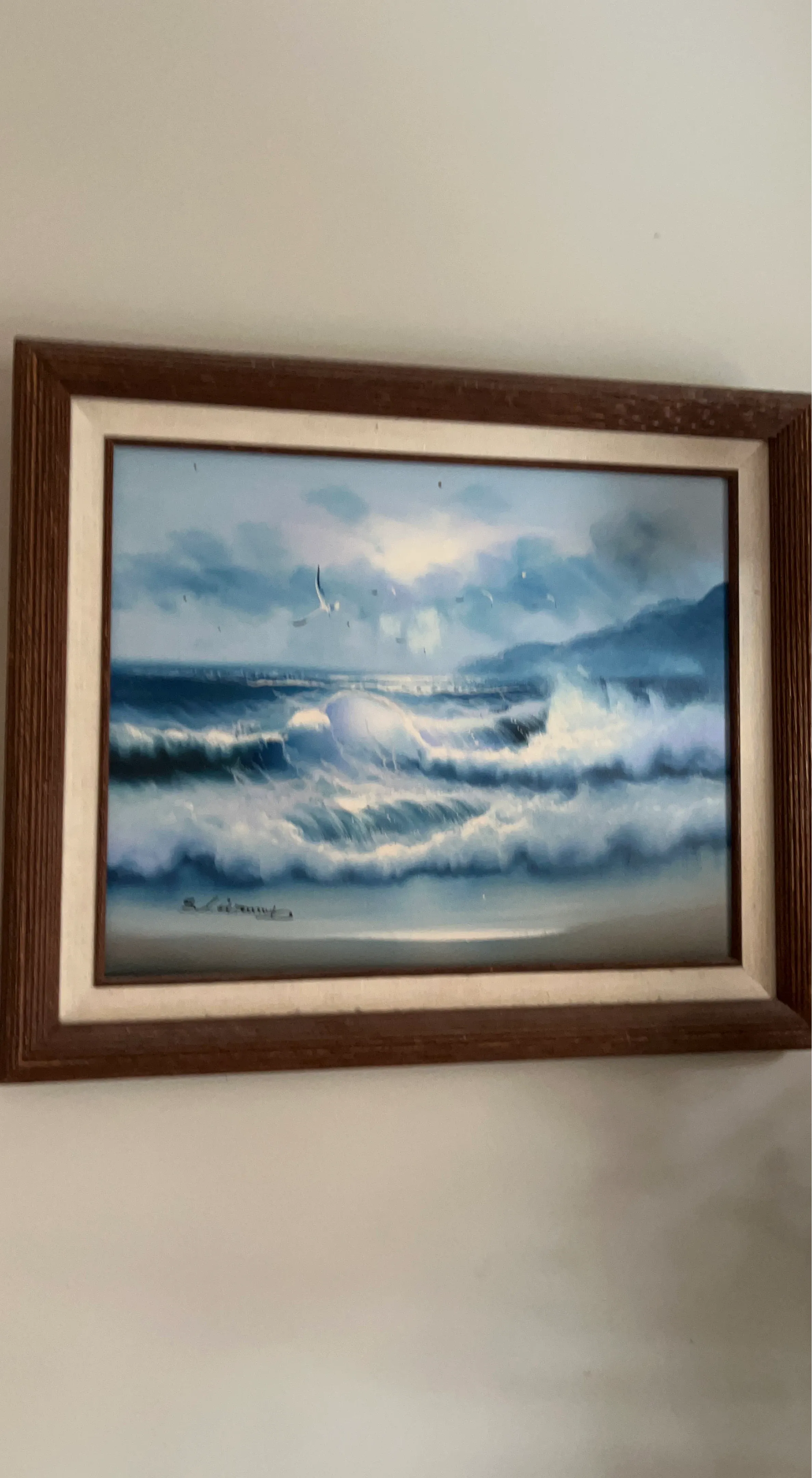 Beautiful framed oil painting depicting a dynamic seascape with crashing waves and seagulls. The artwork is signed by the artist, though the name is not clearly legible. It's housed in a classic wooden frame with a neutral matting. A lovely piece to add to any home decor!